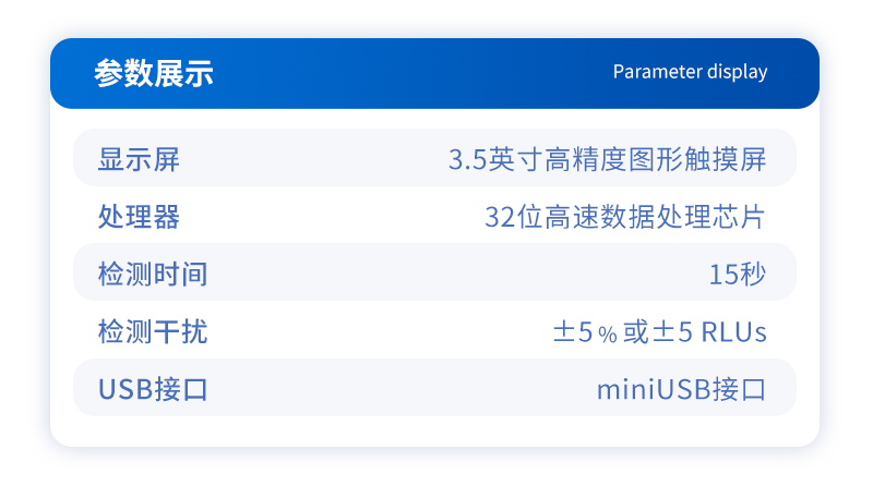 顯示屏:3.5英寸高精度圖形觸摸屏 處理器:32位高速數據處理芯片 檢測限:1.0×10^-13mol ATP 檢測時間:15秒 檢測干擾:±5﹪或±5 RLUs 操作溫度范圍:5℃到40℃ 操作濕度范圍:20—85﹪ ATP回收率:90-110% 檢出模式:RLU 50個用戶ID 設定 可設定的結果限值個數:251個 自動判斷合格與不合格 自動統計合格率 內置自校光源 開機30秒自檢 配有miniUSB接口,可將結果上傳至PC 配備專用軟件驅動U盤代替傳統光盤 儀器尺寸(W×H×D):188 mm×77mm×37mm 使用可充電鋰電池免電池更換 備用狀態(20℃):6個月 中文操作手冊 穩定的液體熒光素酶 潤濕的一體化采集拭子