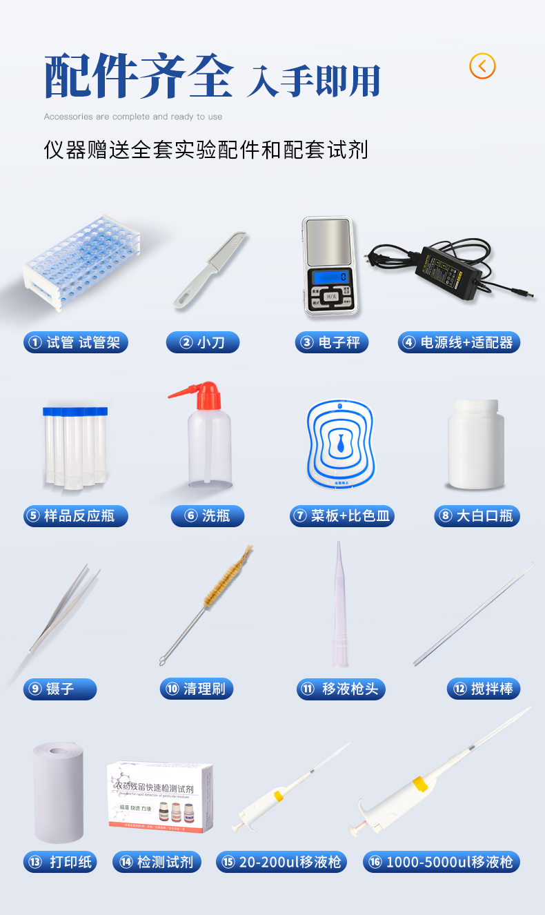 | 主控芯片采用ARM Cortex-A7,RK3288/4核處理器,主頻1.88Ghz,運轉速度更快速,穩定性更強。 | 顯示方式:7英寸液晶觸摸屏顯示,人性化中文操作界面,讀數直觀、簡單。 | 直流12V供電,可連接車載電源,可配6ah大容量充電鋰電池,方便戶外流動測試。 | 智能恒流穩壓,光強自動校準,長時間連續工作光源無溫漂現象。 | 不間斷進樣,連續檢測 | 樣本編號自動累加。 | 檢測項目可擴充。 | 檢測結果可批量打印,批量上傳。 | 檢測結果為Excel表格,連接電腦即可拷貝。 | 可配置大容量鋰電池,固件可升級 |