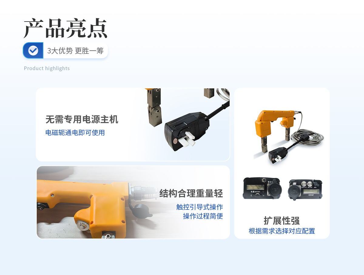 | 1、 無需專用電源主機,電磁軛通電即可使用; | 2、 體積小巧,重量輕; | 3、 開模制作,結構合理,手感舒適; | 4、 磁軛標配白光燈,可選熒光燈(不額外加費用); | 5、 配專用儀器箱; | 6、 擴展性強,可根據(jù)需要增配對應的專用電池包,通過專用電源來實現(xiàn)交流、直流磁化功能。可滿足不方便拖電源線的場所使用。 |
