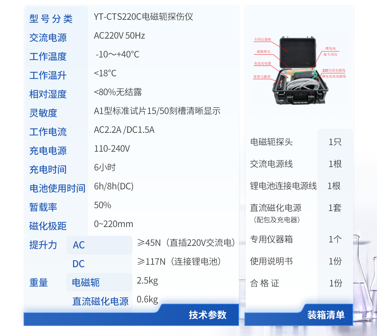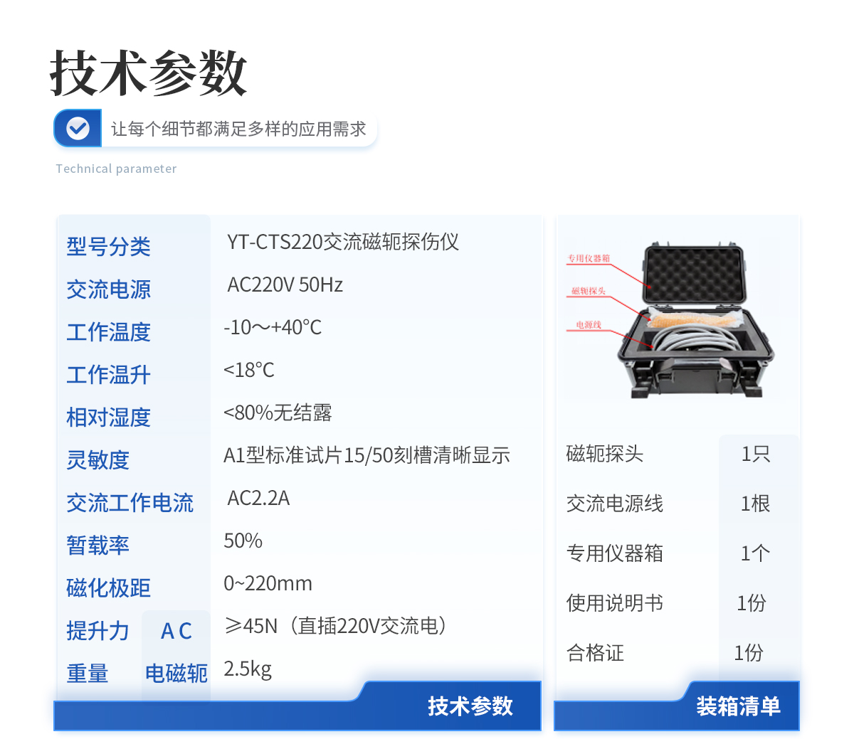 YT-CTS220交流磁軛探傷儀 ,無主機設計,操作簡單方便,噪音小、重量小、適用性強,工作穩(wěn)定。適用于電力、冶金、石化、機械等行業(yè)各類鋼鐵結構件,鍋爐、壓力容器、壓力管道及各類型焊接結構的鐵磁性材料表層及近表層缺陷的磁粉探傷。該探傷儀可以直接連接交流電使用,也可以選配交流磁化電源和直流磁化電源使用,**輕便。特別適用于船體焊縫檢測、高空鋼結構焊縫檢測及壓力容器內部作業(yè)。