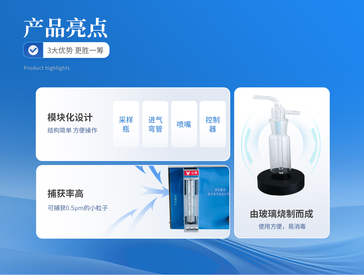 | 1、適用于高濃度的微生物氣溶膠的采樣,可將采集的樣品進行稀釋,從而準確測定出空氣微生物粒子濃度。 | 2、能將采集的樣品分別分析,樣品可分成幾份,同時用幾種方法測定,達到多種實驗目的;還可以將一部分采樣液置冰箱中保存,以供作重復測定和進一步的分析。 | 3、液體撞擊采樣器在采樣過程中因氣流沖擊和采樣液攪動,可以把微生物粒子團中的多個微生物釋放出來,均勻分布在采樣液中,作進一步的生物培養后能準確測出空氣中的微生物數量。 | 4、捕獲率高。對小粒子氣溶膠尤為敏感,可捕獲0.5μm的小粒子。 | 5、采樣液有保護作用,對脆弱的微生物(如病毒、立克次氏體)也能采樣。 | 6、液體撞擊采樣器由玻璃燒制而成,結構簡單,價格低廉,使用方便,易消毒,可反復使用。 采樣流量:3-30升/分 采樣液量:10--20毫升 |