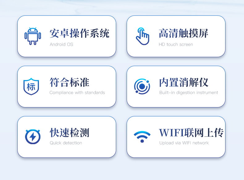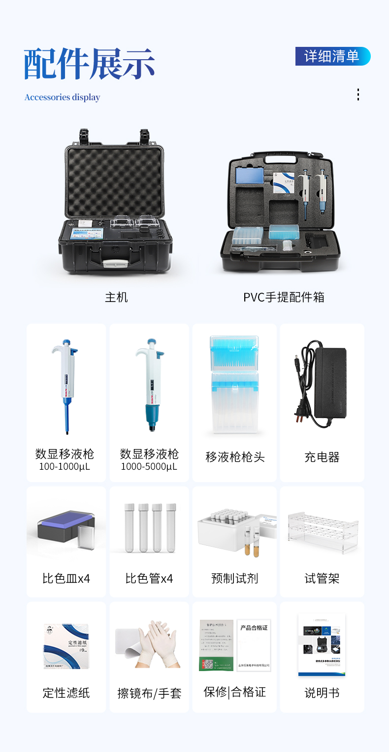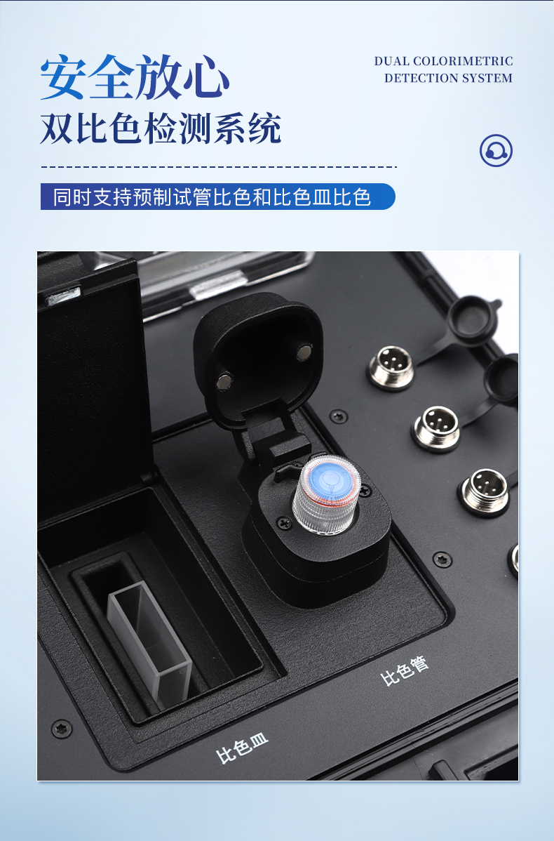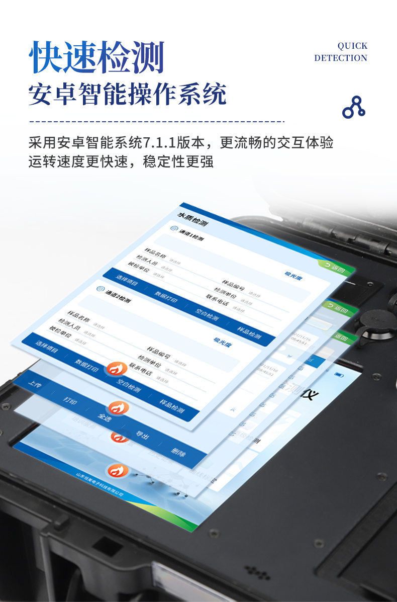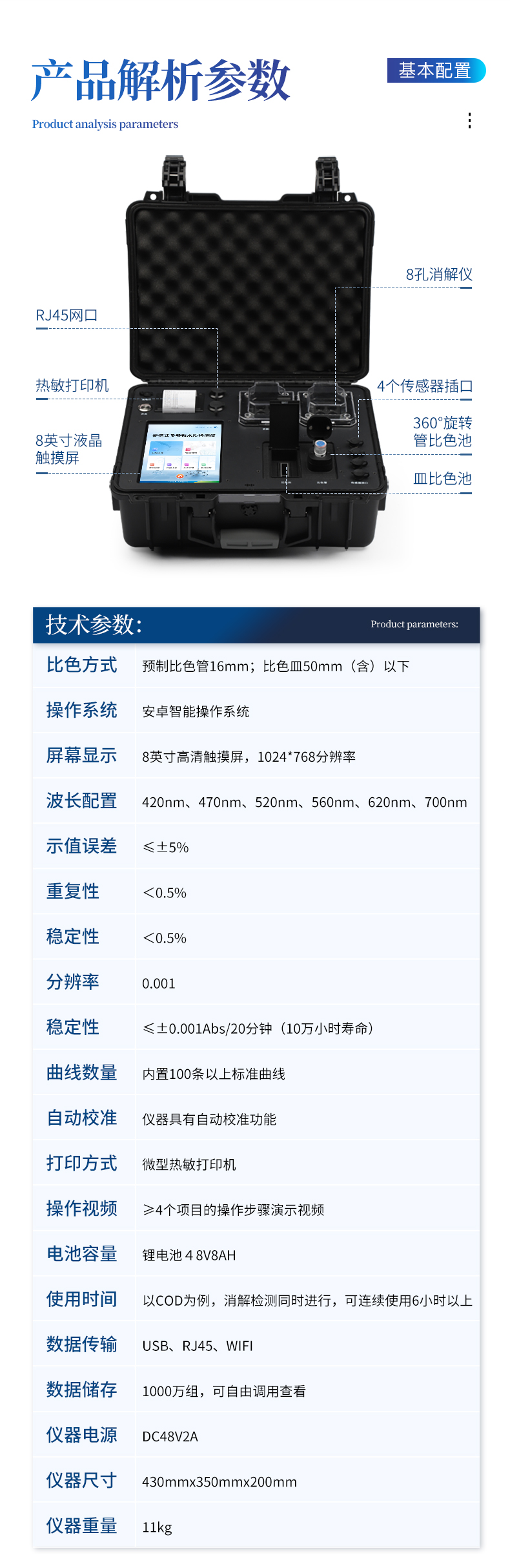 | 1、采用安卓智能系統(tǒng)7.1.1版本,更流暢的交互體驗(yàn),運(yùn)轉(zhuǎn)速度更快速,穩(wěn)定性更強(qiáng)。 | 2、雙比色檢測(cè)系統(tǒng),同時(shí)支持預(yù)制試管比色和比色皿比色; | 3、比色管檢測(cè)部分采用360°精密旋轉(zhuǎn)裝置,有效保證精度,穩(wěn)定性10倍提升。 | 4、內(nèi)置雙溫區(qū)8孔消解儀,左右溫區(qū)獨(dú)立控制,可對(duì)COD總磷總氮等進(jìn)行快速消解。 | 5、便攜一體式檢測(cè)設(shè)備,內(nèi)置大容量鋰電池,可一機(jī)實(shí)現(xiàn)戶外水樣消解、測(cè)定。 | 6、內(nèi)置熱敏打印機(jī),支持自動(dòng)、批量打印,可靈活選擇、編輯打印內(nèi)容,支持二維碼打印。 | 7、儀器具有WIFi無線、4G遠(yuǎn)傳和RJ45有線聯(lián)網(wǎng)功能,將數(shù)據(jù)上傳; | 8、配備霍爾德數(shù)據(jù)云平臺(tái),可接收儀器的檢測(cè)數(shù)據(jù),應(yīng)用于線上數(shù)據(jù)存儲(chǔ)、長(zhǎng)短期動(dòng)態(tài)分析; | 9、用戶可自建標(biāo)樣曲線,提供系數(shù)曲線和樣品曲線的自定義標(biāo)定。 | 10、儀器內(nèi)置教學(xué)演示視頻,用戶可邊看視頻邊操作實(shí)驗(yàn),更容易上手。 | 11、檢測(cè)、消解可同時(shí)進(jìn)行,大大提**率。 | 12、可根據(jù)用戶要求定制檢測(cè)項(xiàng)目。 | 13、配備工廠預(yù)制試劑耗材,無需反復(fù)移液和配制濃硫酸,只需要在試管內(nèi)加入水質(zhì)樣品即可進(jìn)行檢測(cè)。 | 14、內(nèi)置人性化置頂功能,可將常測(cè)定指標(biāo)進(jìn)行置頂,置頂后顯示在項(xiàng)目列表*上方,無需每次繁瑣找取; |