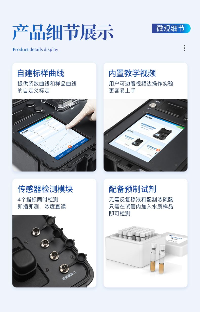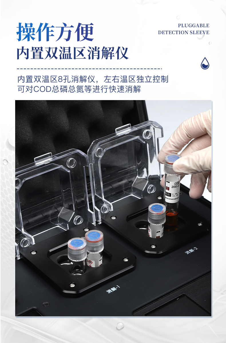 設(shè)備簡(jiǎn)介: YT-B04型便攜式COD氨氮總磷總氮檢測(cè)儀采用高強(qiáng)度PVC工程塑料手提箱設(shè)計(jì),消解檢測(cè)一體式設(shè)計(jì),其中消解模塊具備雙溫區(qū)功能,檢測(cè)部分同時(shí)具備360°旋轉(zhuǎn)比色管檢測(cè)和比色皿檢測(cè),安卓···