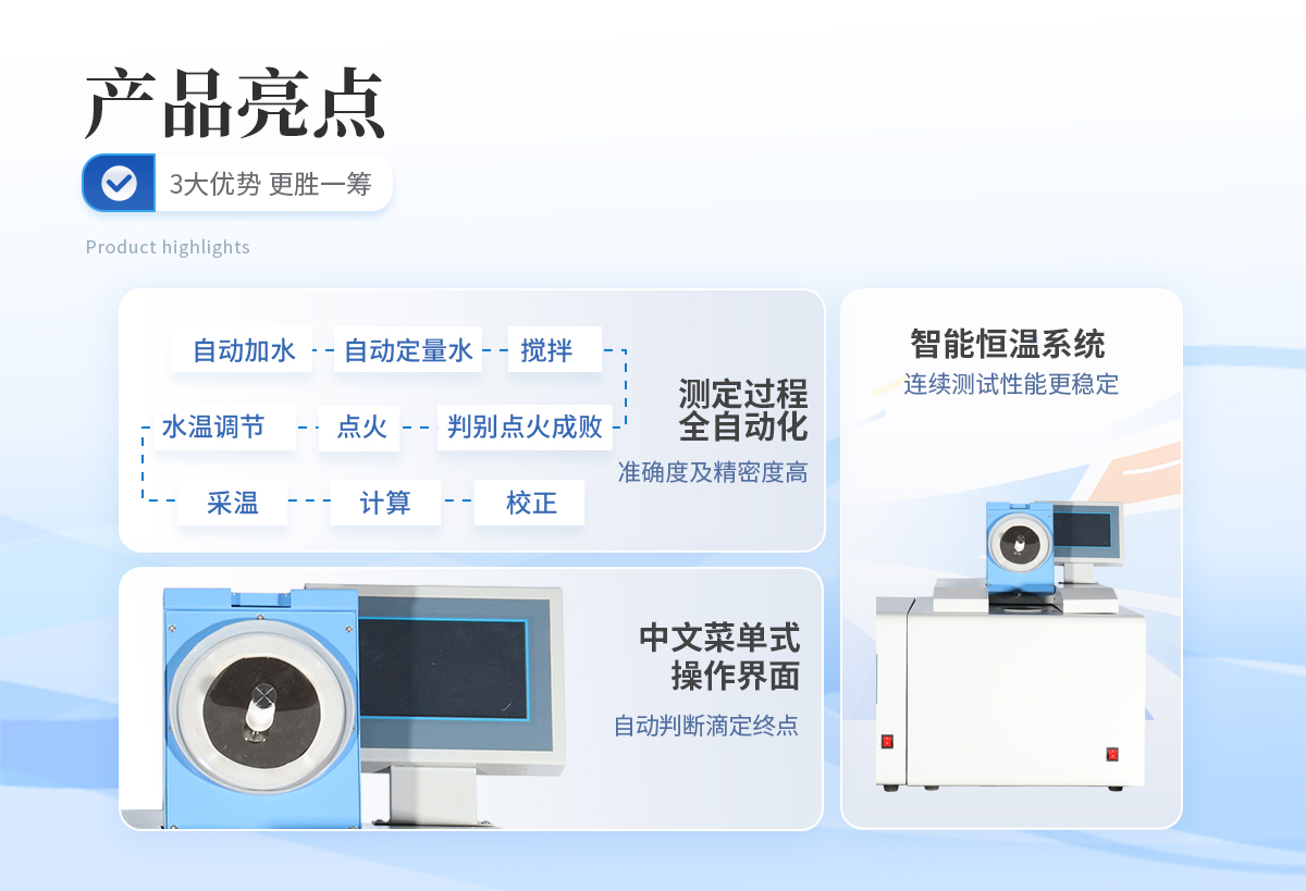 | 1、采用單片機系統來控制儀器,實現啟動后自動加水、自動定量水、攪拌、水溫調節,點火、判別點火成敗、采溫、計算、校正 。 | 2、裝氧彈外,實現測定過程全自動化,無人為誤差,準確度及精密度高。 | 3、中文菜單式操作界面,在中文大屏幕液晶提示下,用戶裝好氧彈即可完成實驗過程。 | 4、根據用戶需要可加備USB插口,和windowsXP操作系統,即可實現微機控制。 | 5、結構合理,制作精良,測量準確度高,分析速度快,性能穩定,抗干擾能力強,使用可靠 | 6、性能穩定、故障率低、系統常數和實驗結果可長時保存并且關機后不丟失等特點。 |