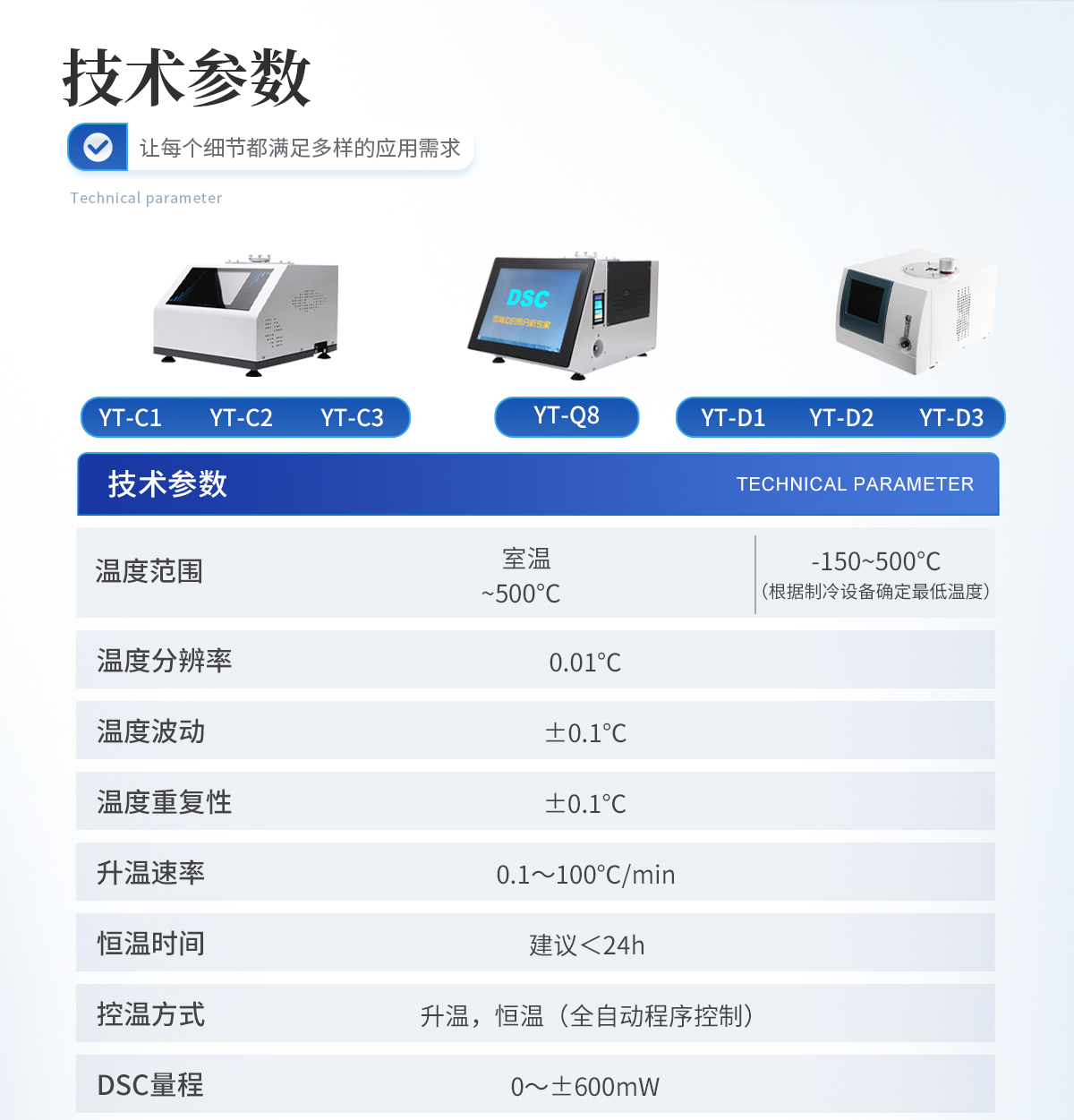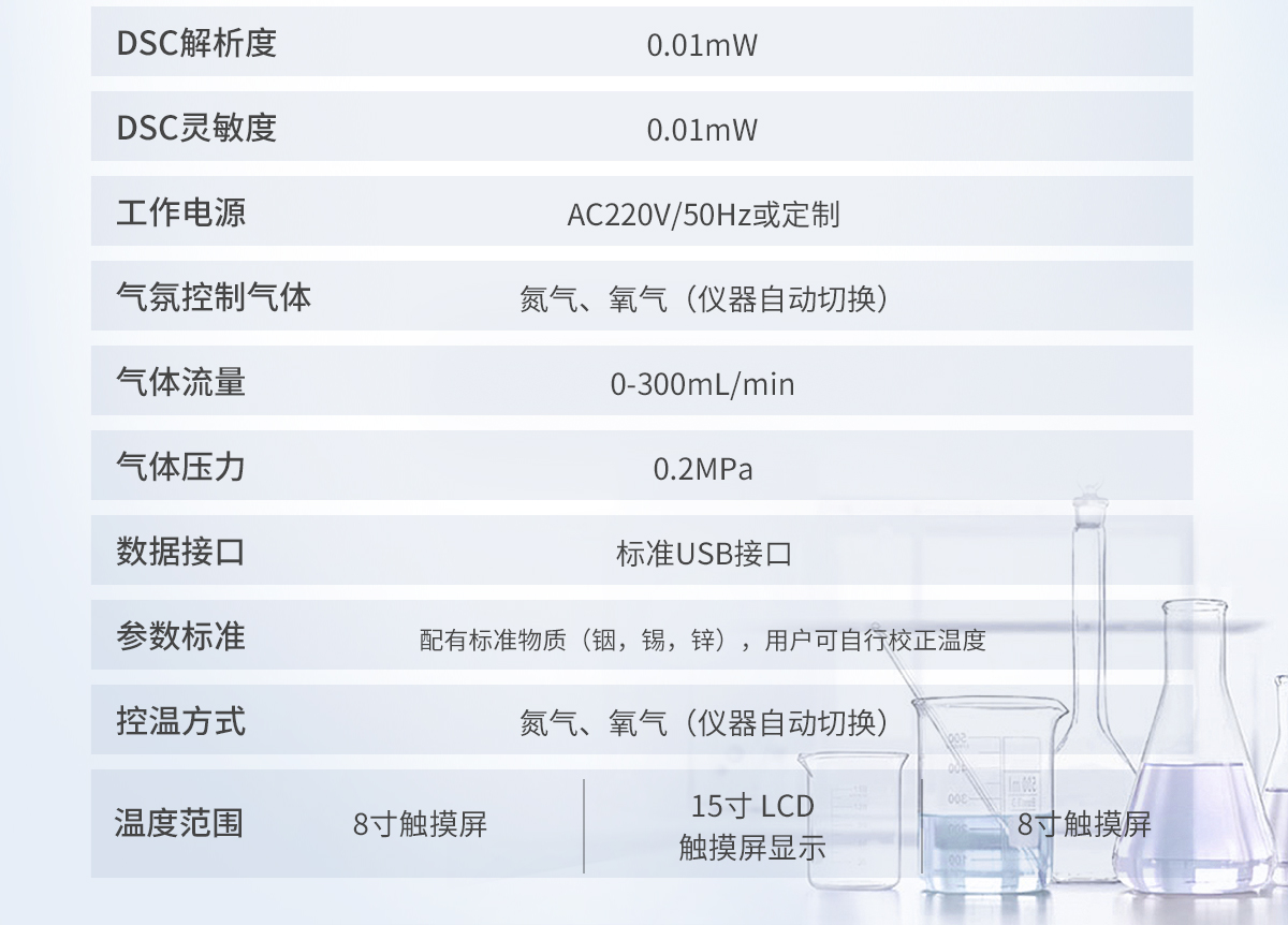 | 1.溫度范圍: -150~500℃ (根據制冷設備確定**溫度) | 2.溫度分辨率: 0.01℃ | 3.溫度波動: ±0.1℃ | 4.溫度重復性: ±0.1℃ | 5.升溫速率: 0.1~100℃/min | 6.恒溫時間:建議<24h | 7.控溫方式:升溫,恒溫(全自動程序控制) | 8.DSC量程: 0~±600mW | 9.DSC解析度: 0.01mW | 10.DSC靈敏度: 0.01mW | 11.工作電源: AC220V/50Hz或定制 | 12.可選冷卻設備: - 壓縮空氣冷卻(-AR):RT ... 500℃ - 機械制冷(-MR): -40 ... 500℃ - 液氮制冷(-LN):-150 ... 500℃ (可以單獨或同時連接多種冷卻裝置) | 13. 氣氛控制氣體:氮氣、氧氣(儀器自動切換) | 14.氣體流量:0-300mL/min | 15.氣體壓力:0.2MPa | 16.顯示方式: 24bit色,8寸 LCD觸摸屏顯示 | 17.數據接口:標準USB接口 | 18.參數標準: 配有標準物質(銦,錫,鋅),用戶可自行校正溫度 |