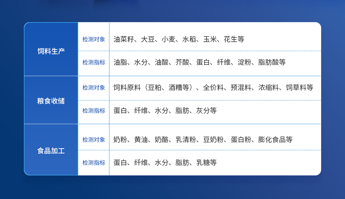 檢測對象:奶粉、黃油、奶酪、乳清粉、豆奶粉、蛋白粉、膨化食品; 檢測指標:蛋白、纖維、水分、脂肪、乳糖等; |