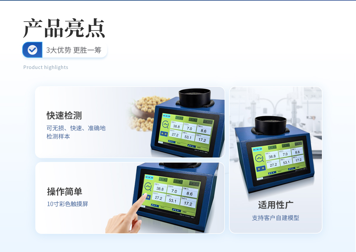 近紅外光譜分析儀,是針對原糧、食品、飼料等行業開發的專用 檢測設備,可無損、快速、準確地檢測樣本的水分、脂肪、蛋白質等多種指標。