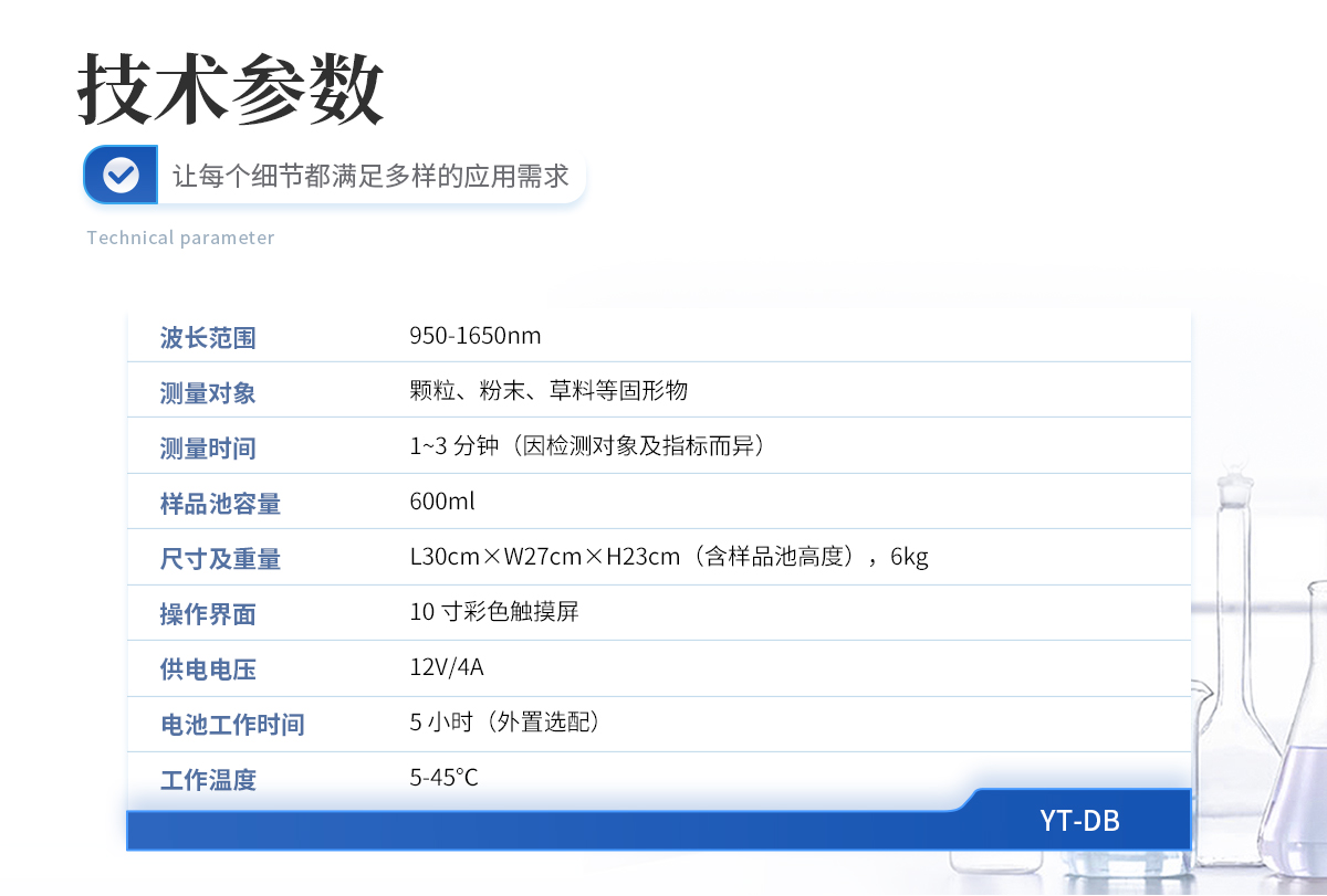 | 波長范圍:950-1650nm | 測量對象:顆粒、粉末、草料等固形物 | 測量時間:1~3 分鐘(因檢測對象及指標而異) | 樣品池容量:600ml | 尺寸及重量:L30cm×W27cm×H23cm(含樣品池高度),6kg | 操作界面:10 寸彩色觸摸屏 | 供電電壓:12V/4A | 電池工作時間:5 小時(外置選配) | 工作溫度:5-45℃ |