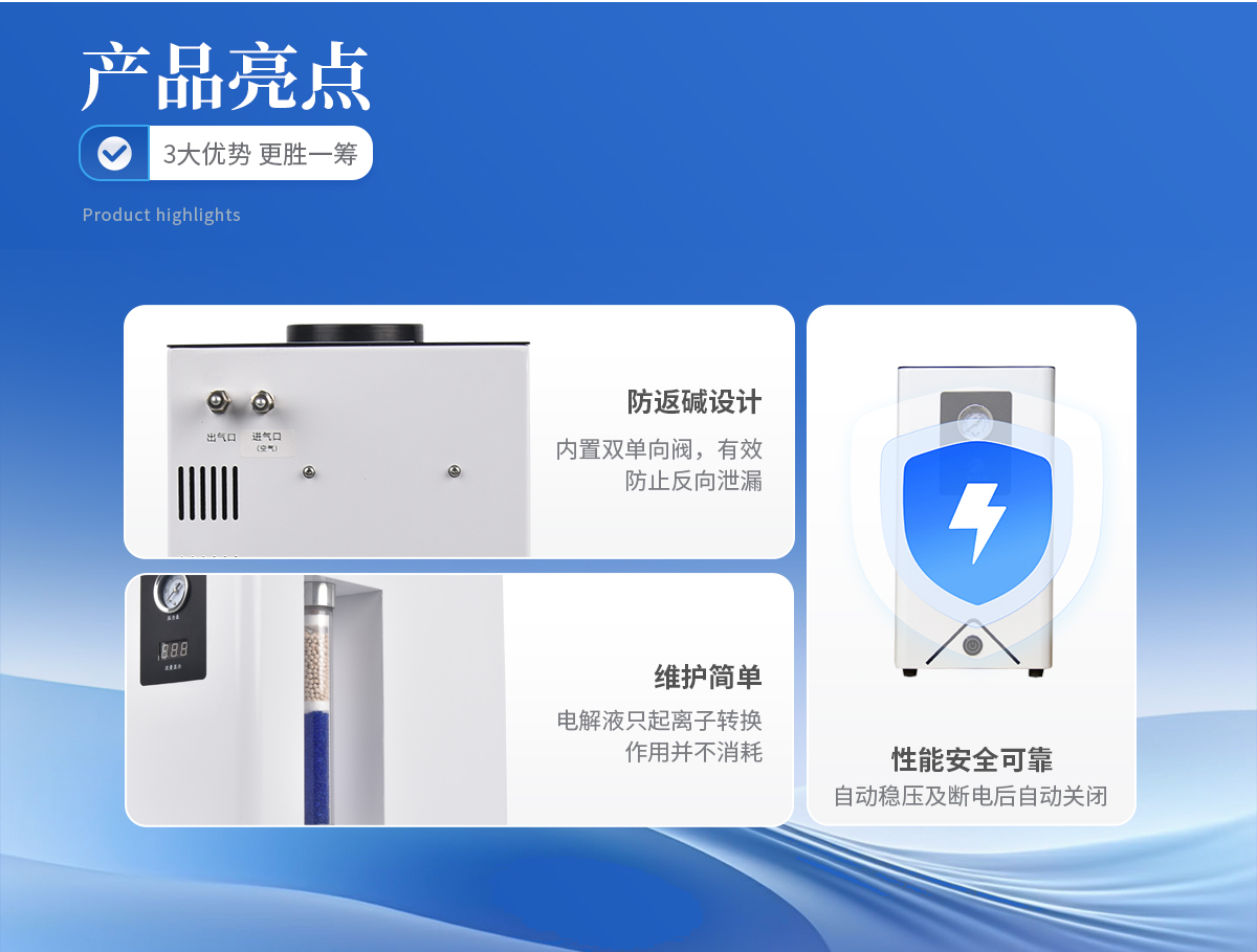 | 1、可替代高壓鋼瓶,雙陰極不銹鋼電解分離池,電解制氮、開機產氣、靈活方便 | 2、低廉的維護成本,正常使用中只需要添加純凈水即可連續使用 | 3、獨特的防返液裝置,使得儀器無反液現象,三級純度做到更好凈化 | 4、大容量儲水器,使得一次加水可達數日連續不間斷運行 | 5、一次性拉伸模具的凈化管使得漏點減小,更大可能的保護儀器可靠性 |