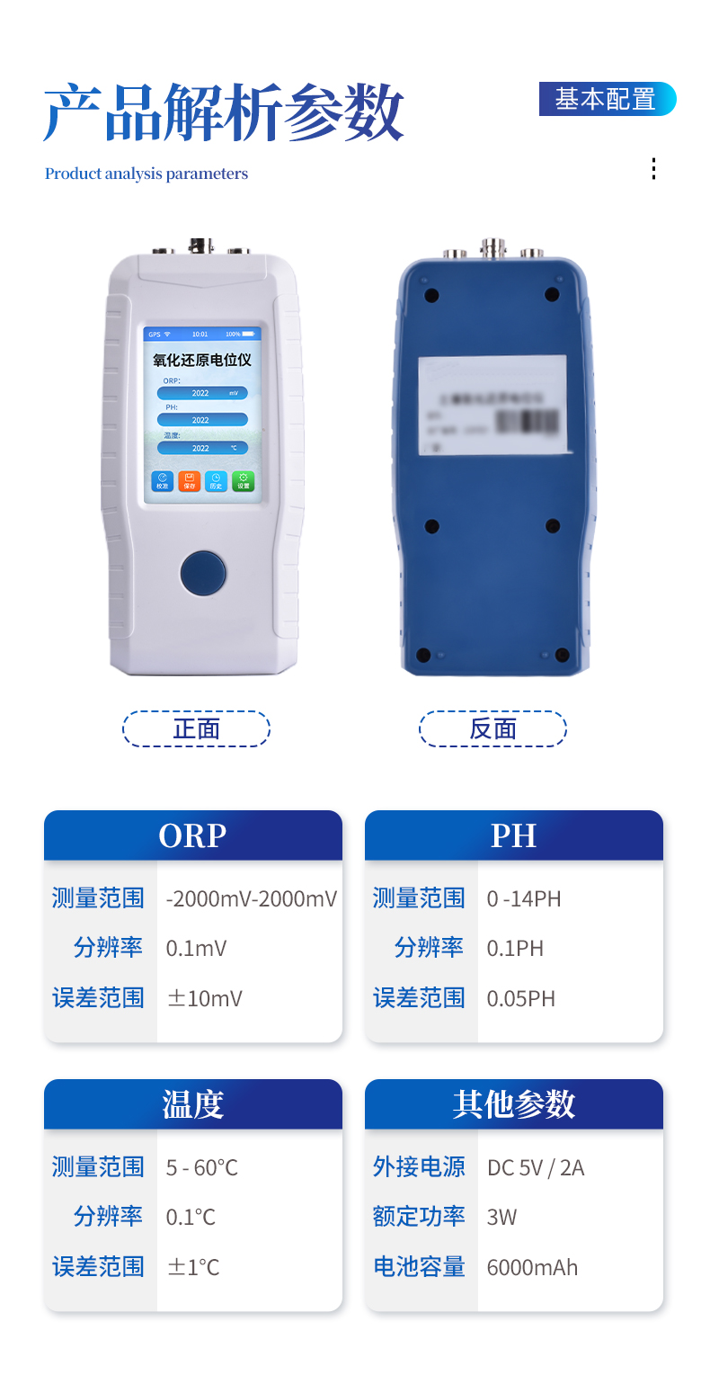 | (1)ORP:測量范圍 -2000mV——2000mV 分辨率 0.1mV 誤差范圍 ±10mV | (2)PH: 測量范圍 0——14PH 分辨率0.1PH 誤差范圍:0.05PH | (3)溫度:測量范圍 5——60℃ 分辨率:0.1℃ 誤差范圍 ±1℃ | (4)外接電源:DC 5V /2A | (5)額定功率:3W | 6)電池容量:6000mAh |