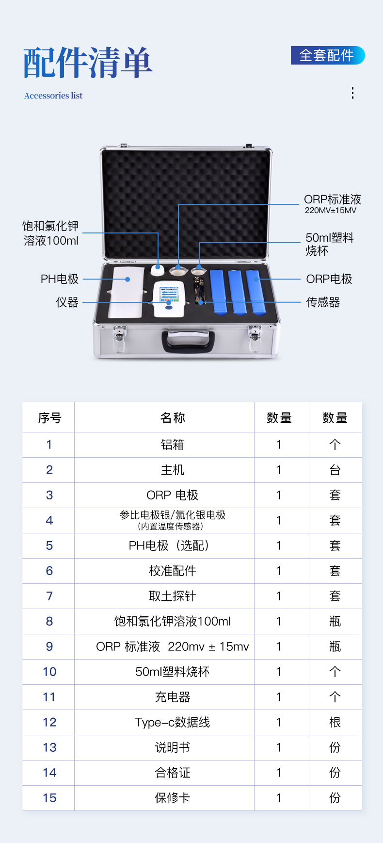 | 名稱 | 鋁箱 | 主機 | ORP電極 | 參比電極 | PH電極 | 校準配件 | 取土探針 | 飽和氯化鉀溶液100ml | ORP標準液 220mv±15mv | 50ml塑料燒杯 | 充電器 | Type-c數(shù)據(jù)線 | 說明書 | 合格證 | 保修卡 |