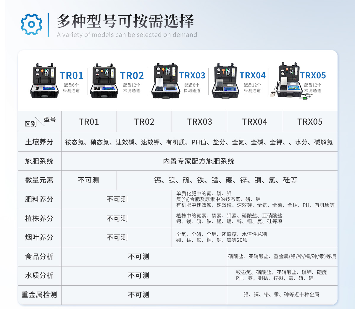 | 肥料養分:● 單質化肥中的氮、磷、鉀; ● 復(混)合肥及尿素中的銨態氮、硝態氮、磷、鉀、縮二脲; ● 有機肥(葉面肥)中速效氮、速效磷、速效鉀、全氮、全磷、全鉀、有機質,各種腐植酸等。可擴展檢測鈣、鎂、硫、鐵、錳、硼、鋅、銅、氯、硅等微量元素以及各種重金屬(鉛鉻鎘汞砷)。 |