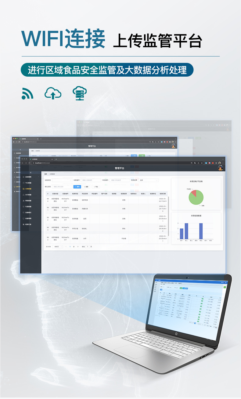 儀器采用臺式一體化系統檢測技術,將分光光度模塊、膠體金檢測模塊、新型農殘檢測模塊、數字化管理模塊、無線通訊模塊高度集成于一體,支持檢測200種食品安全檢測項目,同時預留升級檢測方法。儀器檢測模塊標準化、智能化,可隨意自由組合。檢測箱體內置多個標準檢測單元,檢測模塊可以調整配置。 儀器采用全新安卓智能系統,主控芯片采用 ARM Cortex-A7,RK3288/4核處理器,10.1寸高清液晶觸摸豎屏,更加**的UI交互界面,運轉快捷;儀器配備無線通信模塊: 4G(APN)通訊模塊、Wifi模塊,藍牙傳輸,同時具有雙USB接口以及RJ45接口能以多種方式實現數據保存和數據傳輸功能。創新檢測模式★檢測通道:≥12通道;采用精密旋轉比色池設計,使用同芯片同光源校準精度,解決不同光源之間的誤差值。1-12通道間誤差0.1%。(***:**202022821055.2) ★儀器具有自動識別比色皿檢測功能,即:將樣品比色皿放入儀器后,點擊樣品檢測,儀器自動識別比色皿進行通道檢測。進口高精光源:高精度進口四波長冷光源,通道配置 410、520、590、630nm 波長光源,一個光源芯片驅動一個光源,誤差極小,每臺設備單獨**校準光源,**比對,同時參照四種不同波段光源全方位覆蓋市面上99%的農殘食品項目檢測。膠體金模塊檢測方式:★采用COMS實時成像技術,可采集多個畫面,支持2個金標同時讀卡,通過不同顏色的灰度變化,一秒精準得出結果。智能操作分析系統:★便捷操作系統:設備檢測時可在同一檢測界面自動對應相關檢測通道一次性選擇1-12個樣品名稱,無須退出界面,節省操作時間。(需提供對應證明) ★數據集成系統:設備首頁自動統計檢測數據包含:周檢測數據、月檢測數據,全部檢測總數量,均包含檢測總數,合格數,不合格數,以及相關柱形分析圖,對各項檢測數據清晰掌握,無需電腦查詢,更加快捷直觀。(需提供對應證明文件)★項目預設系統:支持添加單個及多個相同或不相同的任務預設,一鍵快速調取,每一個任務分別可以設置不同的樣品、批次、編號、來源、備注、抽樣信息、檢測信息、受檢信息、復核信息等更多信息。無縫鏈接平臺和APP實時查看下發任務。(需提供對應證明文件)★數據監管系統:同步對接監管平臺,數據可局域網和互聯網數據上傳,檢測結果可選擇直接傳至食品安全監管平臺。集成OSS輸出存儲服務、區分設備定向管理應用,進行區域食品安全監管及大數據分析處理與數據統計,檢測區域食品安全長短期動態,達到食品安全問題預估、預警。(需提供對應食品理化分析系統計算機軟件著作權)。★ 自定義打印系統:內置全新打印系統,新創自定義打印方式,可按需靈活設置開啟或關閉:產品合格證(國家農業部標準要求),二維碼,抽樣信息、檢測信息,受檢信息、復核信息、抽樣日期、檢測日期等信息的打印。(需提供對應證明)★系統遠程更新功能:可定向分客戶分儀器更新系統,按照不同客戶后期實際需求添加項目,無需機器返廠,即可遠程實時升級全新系統,節省時間成本及避免運輸造成設備損壞。儀器主機采用一體化防水、抗壓、防撞擊、防腐蝕箱體設計,同時配備交直流供電,可連接車載電源,可選配大容量充電鋰電池,滿足現場野外檢測需求。安全證書,放心保障:儀器具有中國計量科學研究院校準證書,權威認證。