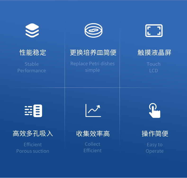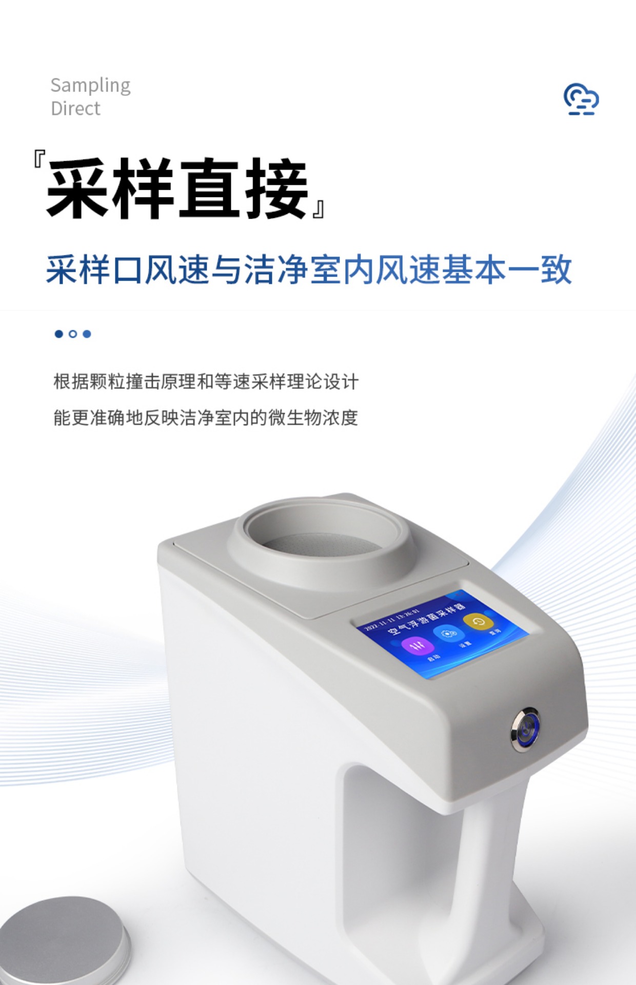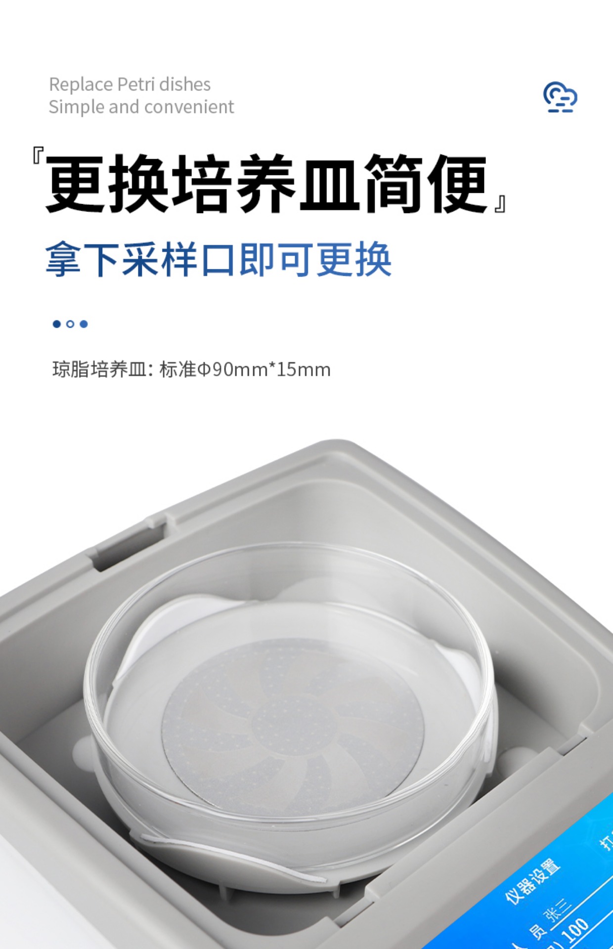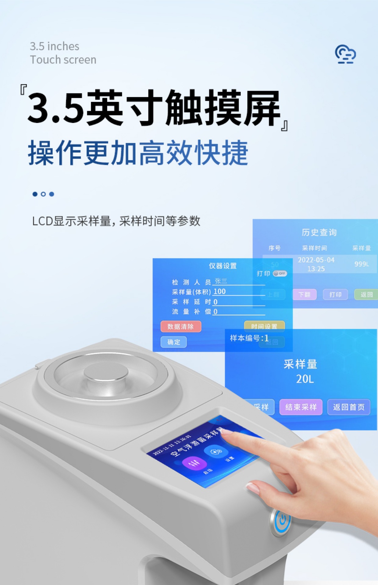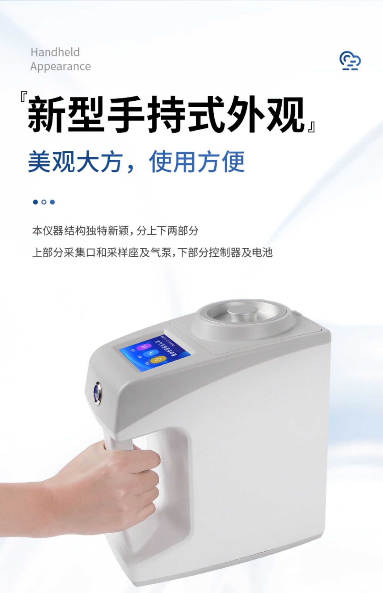 新型手持式外觀,美觀大方,使用方便。彩色觸屏控制,操作更加**快捷。LCD顯示采樣量,采樣時間等參數。可將采樣量,采樣時間等參數按組儲存。更換培養皿簡便,拿下采樣口即可更換培養皿。帶上位機軟件,數據可導出電腦,方便歷史分析。交直流兩用,內置6000mAh大容量鋰電池,可連續采樣8小時。程序支持中英文切換。