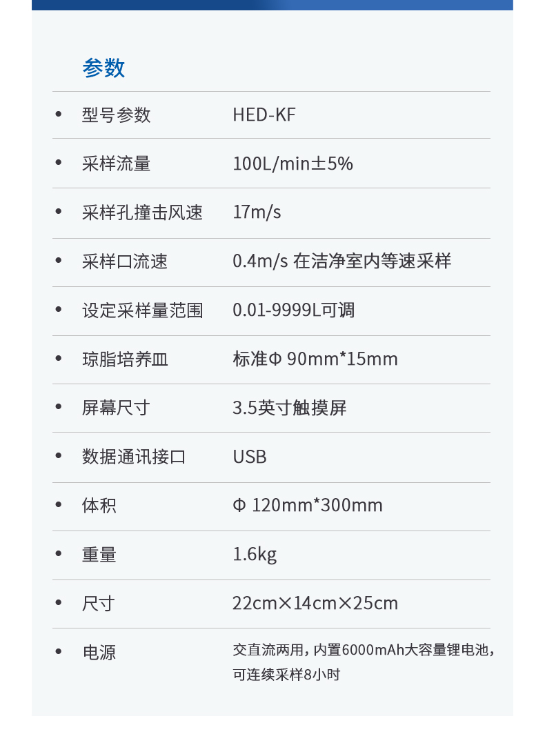 采樣流量:100L/min±5%采樣孔撞擊風速:17m/s采樣口流速:0.4m/s 在潔凈室內等速采樣設定采樣量范圍:0.01-9999L可調瓊脂培養皿:標準? 90mm*15mm屏幕尺寸:3.5寸觸摸屏數據通訊接口:USB體積:Φ 120*300重量:1.6kg尺寸:22×14×25cm