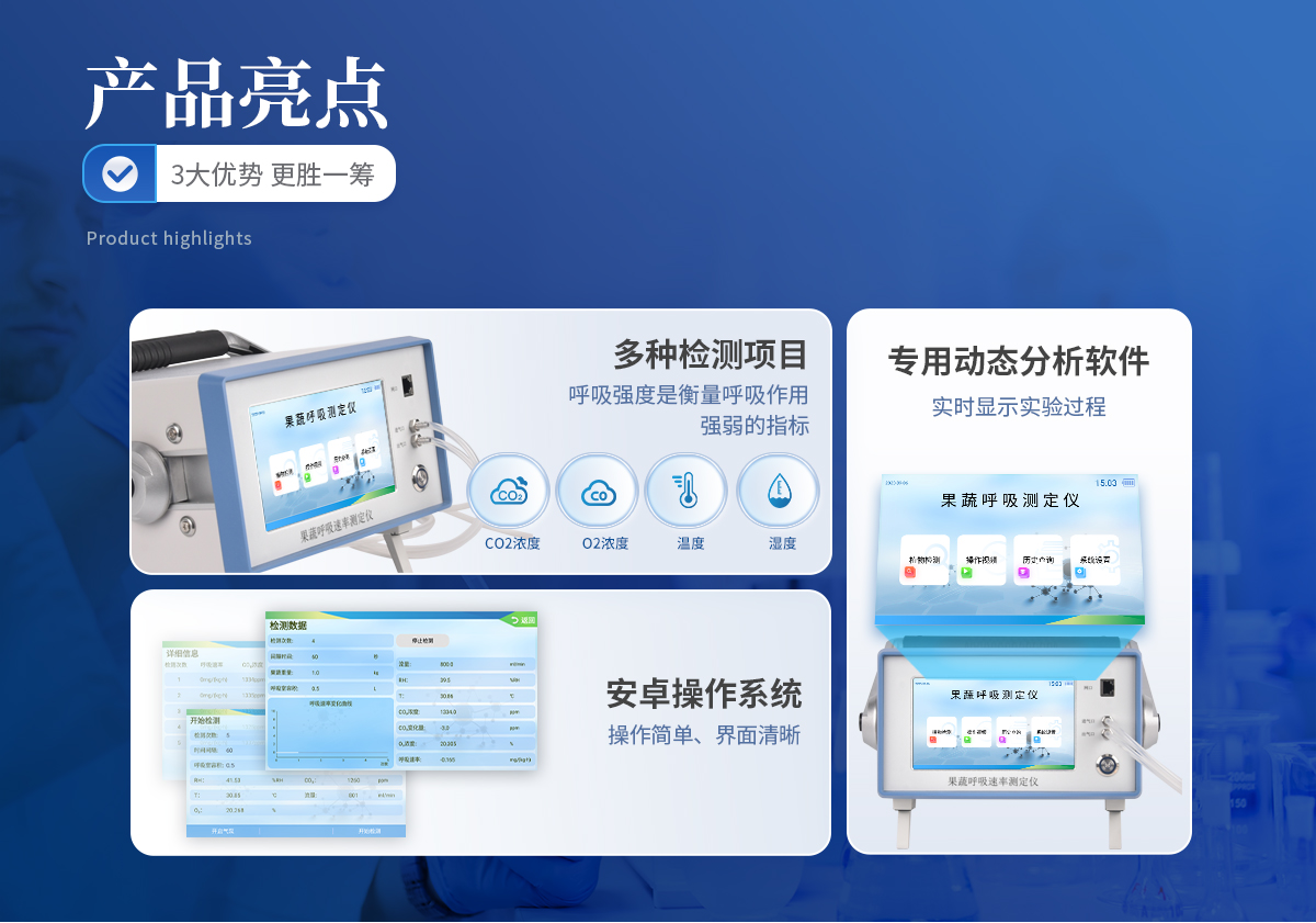 該儀器的特點(diǎn)是可以根據(jù)果蔬的大小來(lái)選擇不同體積的呼吸室,加快了平衡和測(cè)定時(shí)間;可以直接操顯示呼吸室的CO2濃度、O2濃度、溫度和濕度及變化曲線。