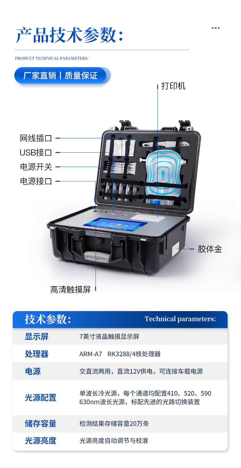 | 主控芯片采用ARM Cortex-A7,RK3288/4核處理器,主頻1.88Ghz,運(yùn)轉(zhuǎn)速度更快速,穩(wěn)定性更強(qiáng)。 | 顯示方式:7英寸液晶觸摸屏顯示,人性化中文操作界面,讀數(shù)直觀、簡(jiǎn)單。 | 交直流兩用,直流12V供電,可連接車(chē)載電源,可配6ah大容量充電鋰電池,方便戶(hù)外流動(dòng)測(cè)試。 | 四波長(zhǎng)冷光源,每個(gè)通道均配置410、520、590、630nm波長(zhǎng)光源,標(biāo)配**的光路切換裝置,專(zhuān)利光路切換功能可實(shí)現(xiàn)*多64波長(zhǎng),并且所有檢測(cè)項(xiàng)目可實(shí)現(xiàn)所有通道同時(shí)檢測(cè)。 | 光源亮度自動(dòng)調(diào)節(jié)與校準(zhǔn) | 智能恒流穩(wěn)壓,光強(qiáng)自動(dòng)校準(zhǔn),長(zhǎng)時(shí)間連續(xù)工作光源無(wú)溫漂現(xiàn)象。 | 內(nèi)置新國(guó)家限量標(biāo)準(zhǔn),與所測(cè)結(jié)果進(jìn)行現(xiàn)場(chǎng)比對(duì),并持續(xù)更新標(biāo)準(zhǔn)。 | 不間斷進(jìn)樣,連續(xù)檢測(cè) | 樣本編號(hào)自動(dòng)累加。 | 數(shù)據(jù)無(wú)線上傳平臺(tái),并可從平臺(tái)導(dǎo)出為Excel表格。 | 檢測(cè)結(jié)果存儲(chǔ)容量20萬(wàn)條 | 同時(shí)支持U盤(pán)拷貝,標(biāo)準(zhǔn)USB接口,免驅(qū)動(dòng)插拔。 | 檢測(cè)項(xiàng)目可擴(kuò)充,固件可升級(jí) | 儀器尺寸:43×35×20cm, 主機(jī)凈重:5.2kg |