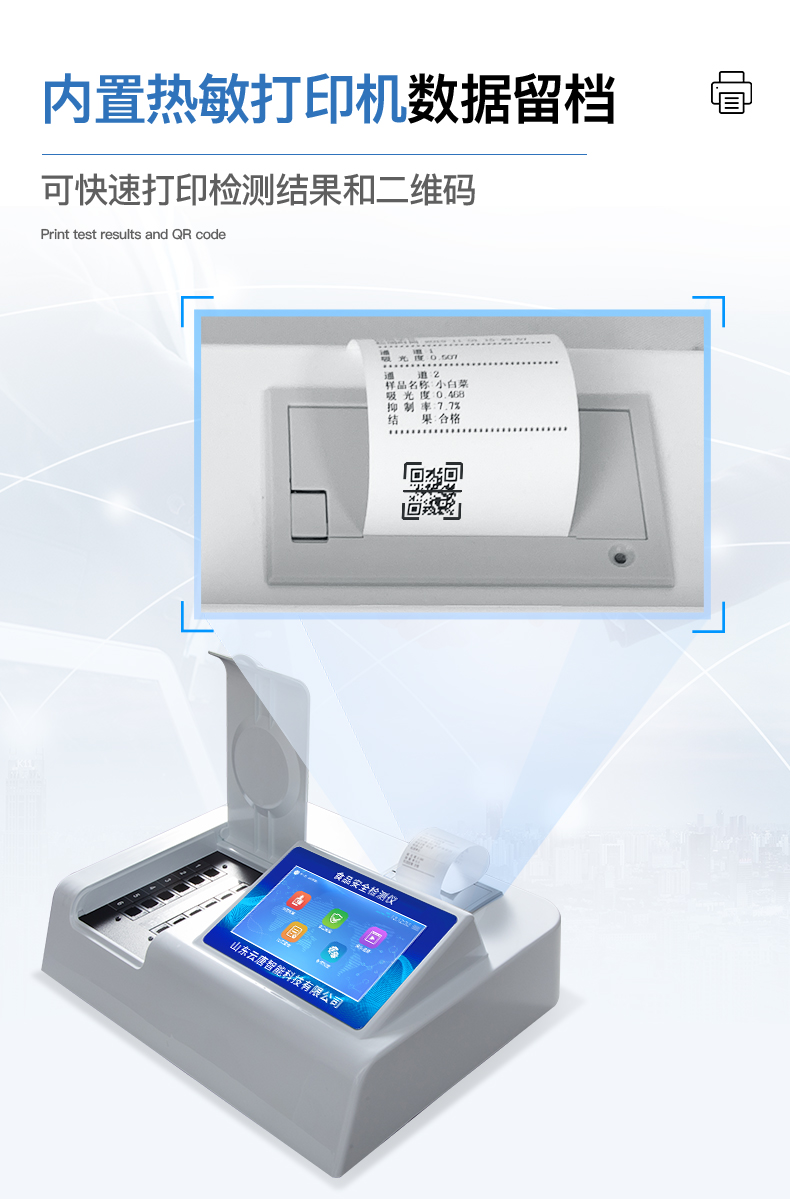 | 1、安卓智能操作系統,采用更加**和人性化操作,儀器具有網線連接、wifi聯網上傳、GPRS無線遠傳功能,快速上傳數據。 | 2、智能化程度高,儀器具有自檢功能:具有開機自檢和調零功能,具有自動檢測重復性功能。 | 3、檢測通道:≥12個檢測通道,可以同時測試多個樣品,每個樣品由程序控制分別獨立工作,不會互相干擾。 | 4、顯示方式:≥8英寸液晶觸摸屏顯示,人性化中文操作界面,讀數直觀、簡單。 | 5、配備新一代嵌入式熱敏打印機,可選擇手動打印或者自動打印,檢測完成可自動打印檢測報告和二維碼。 | 6、光源采用進口超高亮發光二極管,高精度、穩定性強、光源可控、可以關掉不使用的光源,功耗更低。 | 7、采用USB2.0接口設計,方便數據的存貯和移動,并可隨時與計算機直接相連,并且可用計算機控制儀器。實現數據查詢、瀏覽、分析、統計、打印等。 | 8、儀器帶有監管平臺。數據可局域網和互聯網數據上傳,檢測結果直接傳至食品安全監管平臺。進行區域食品安全監管及大數據分析處理,檢測區域食品安全長短期動態,達到食品安全問題預估、預警 | 9、儀器具有品類多種類樣品菜單庫,可靈活選擇檢測樣品,不同的檢測通道可同時檢測不同的樣品項目。 | 10、樣品處理簡單省力,整體操作快速、安全、便捷。 | 11、儀器具有自身保護功能,可設置用戶名及密碼,防止非工作人員操作等。 | 12、高靈敏度,高檢測精度,高重復性精度,掃描式高精度光學傳感器。 | 13、內置強大的數據庫,可在儀器上直接選擇樣品名稱、檢測指標、送檢單位等信息,也可在儀器上直接編輯錄入樣品名稱、檢測指標、送檢單位等信息并保存進樣品數據庫。 | 14、儀器具有重新校準、鎖定、恢復出廠設置功能。 | 15、支持U盤存儲。 結果判定線可修改,對照值標定值可保存,斷電不丟失數據。 |