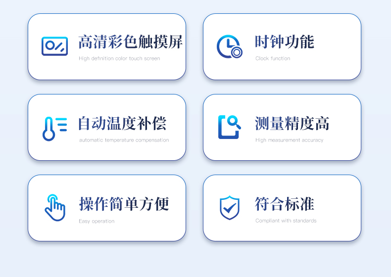 | 儀器采用等一點標定,簡單方便,保證測量精度; | 自動溫度補償;動態張力曲線顯示; | 時鐘功能,掉電存儲功能; | 高清晰彩色觸摸屏,操作更加方便; |