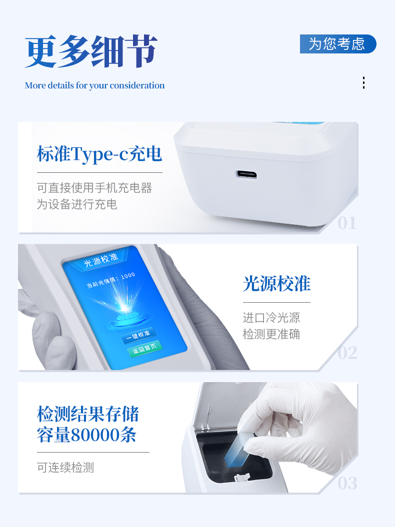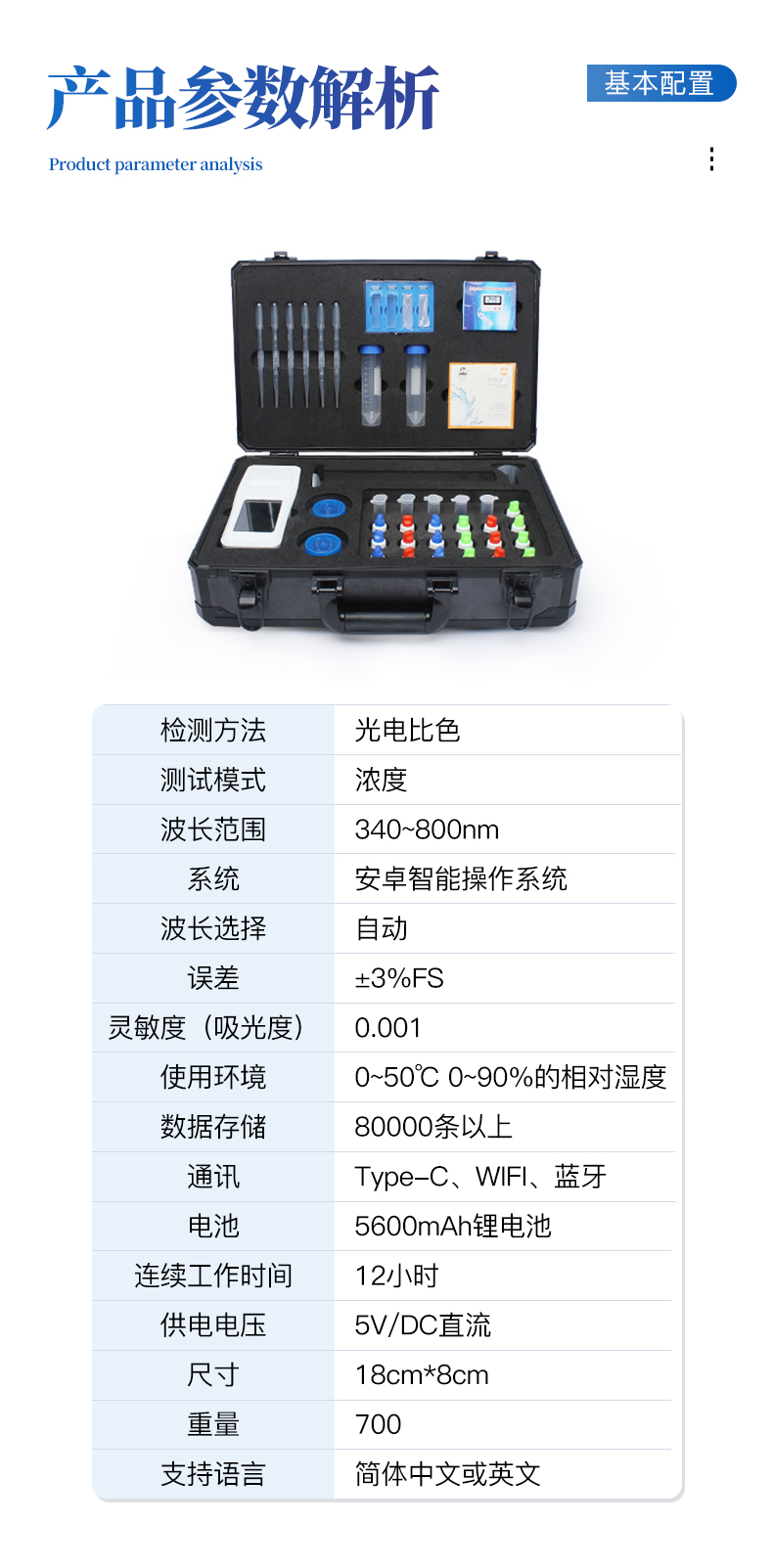 | 檢測方法:光電比色 | 測試模式:濃度 | 波長范圍:340~800nm | 系統:安卓智能操作系統 | 波長選擇:自動 | 顯示屏幕:3.5寸彩色液晶屏 | 穩定性:<0.5% | 靈 敏 度(吸光度):0.001 | 使用環境:0~50℃ 0~90%的相對濕度 | 數據存儲:80000條以上 | 通訊:Type-C、WIFI、藍牙 | 電池:5600mAh鋰電池 | 連續工作時間:12小時 | 供電電壓:5V/DC直流 | 尺寸:18cm*8cm | 重量:700g | 支持語言:簡體中文或英文 |
