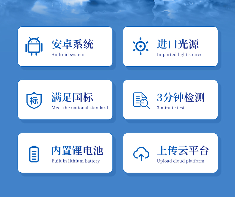 | PH、溶解氧、氨氮、亞硝酸鹽、總堿度、硫化氫、鹽度、磷酸鹽、總硬度、水溫、余氯、檢測指標等 | 安卓智能系統操作更佳簡便快捷 | 內置操作流程、操作簡單、無需培訓、直接上手 | 檢測速度快,現場讀取數據 | 便攜式體積小,重量輕,方便戶外檢測 | 外形小巧美觀,工作穩定免維護,具有較好的性價比 | 采用進口冷光源,光學性能穩定,壽命長達10萬小時 |