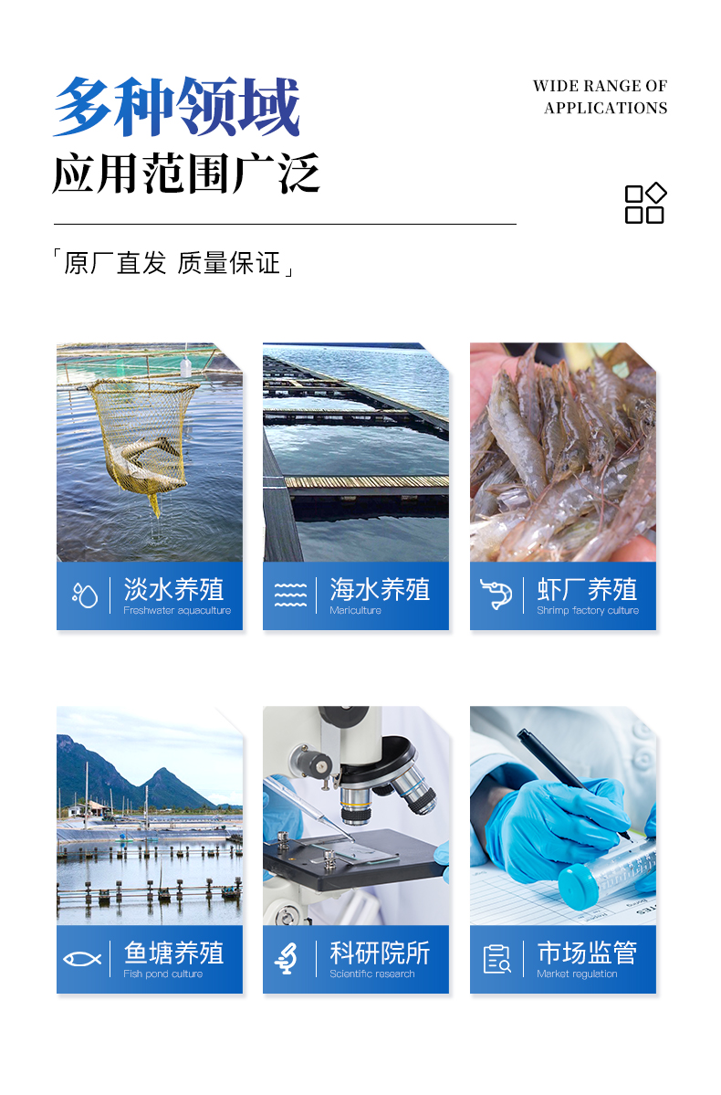 水產養殖水質檢測儀適用于純凈水廠、自來水廠、生活污水處理廠、工業污水、水產養殖、河流監測、游泳場館、水源保護、生產監測、科研實驗等。