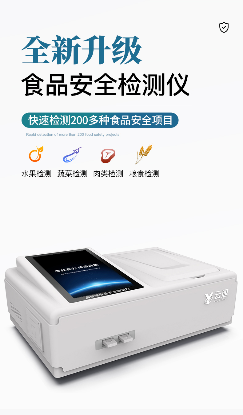山東云唐智能科技有限公司生產(chǎn)的高智能食品安全檢測儀為集成化食品安全快速檢測分析設(shè)備,采用臺式一體化設(shè)計(jì),可快速檢測200多種食品安全項(xiàng)目,包含非食用化學(xué)物質(zhì)、濫用食品添加劑、農(nóng)藥殘留、獸藥殘留、重金屬、病害肉、營養(yǎng)強(qiáng)化劑、抗生素類殘留、激素類殘留、真菌毒素類殘留、化學(xué)類殘留等項(xiàng)目的定性定量檢測。目前廣泛應(yīng)用于市場監(jiān)管局、檢測中心、衛(wèi)生監(jiān)督部門、農(nóng)業(yè)部門、院校及各單位食堂、食品肉產(chǎn)品深加工企業(yè)、商超市場、司法部門、餐飲機(jī)構(gòu)、養(yǎng)殖場、屠宰場、檢驗(yàn)檢疫部門等單位。