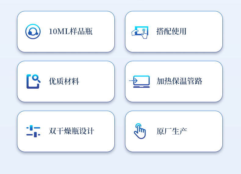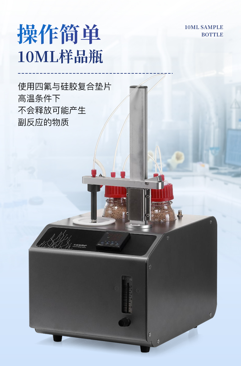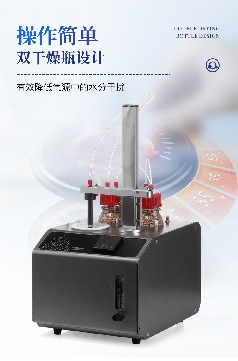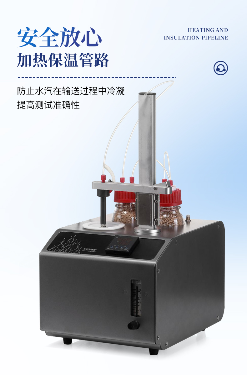 1、10ml樣品瓶:使用四氟與硅膠復合墊片,高溫條件下不會釋放可能產生副反應的物質 2、雙干燥瓶設計,有效降低氣源中的水分干擾 3、加熱保溫管路,防止水汽在輸送過程中冷凝,提高測試準確性