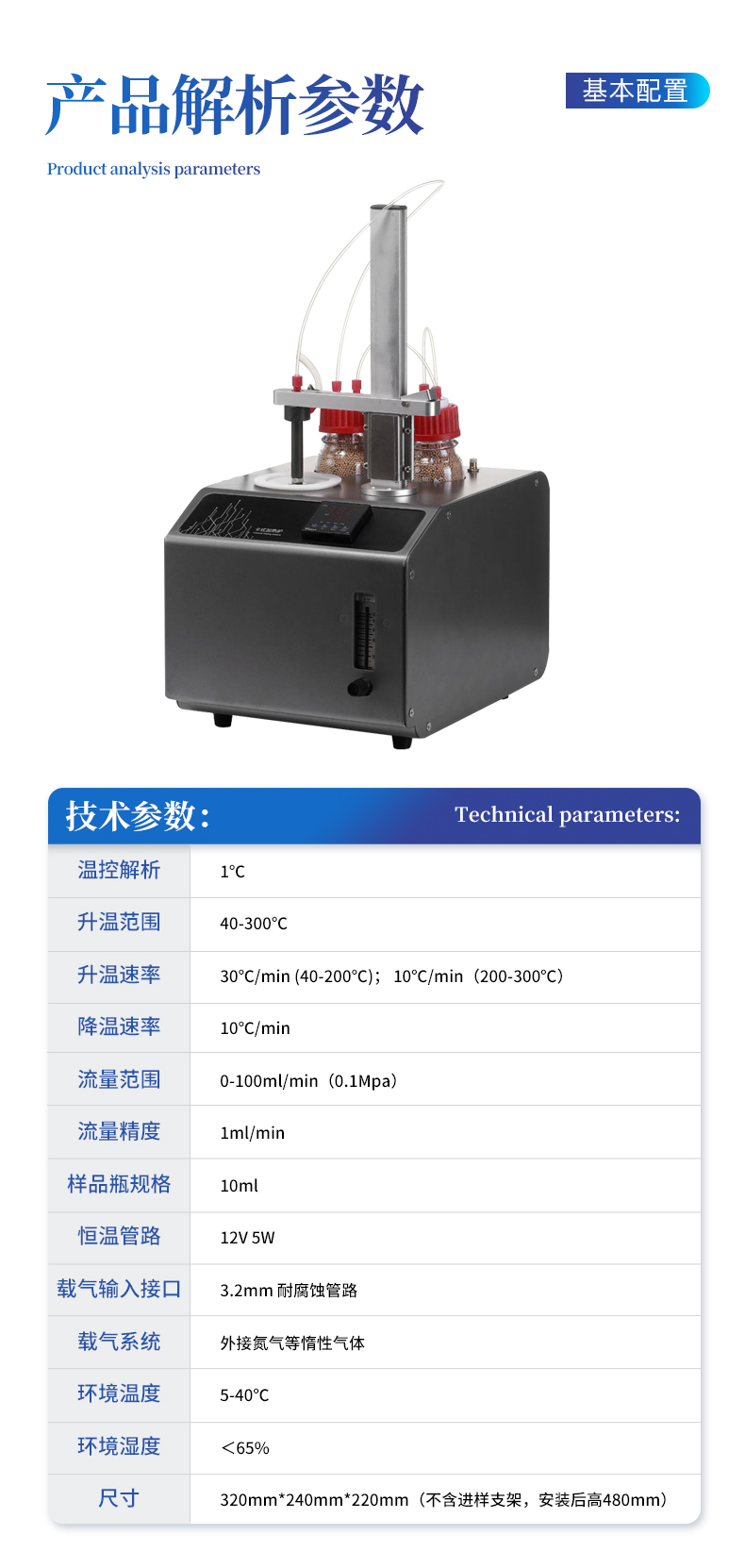 型號:YT-KSL 溫控解析:1℃ 升溫范圍:40-300℃ 升溫速率:30℃/min (40-200℃); 10℃/min(200-300℃) 降溫速率:10℃/min 流量范圍:0-100ml/min(0.1Mpa) 流量精度:1ml/min 樣品瓶規格:10ml 恒溫管路:12V 5W 載氣輸入接口:3.2mm 耐腐蝕管路 載氣系統:外接氮氣等惰性氣體 環境溫度:5-40℃ 環境濕度:<65% 尺寸:320mm*240mm*220mm(不含進樣支架,安裝后高480mm)
