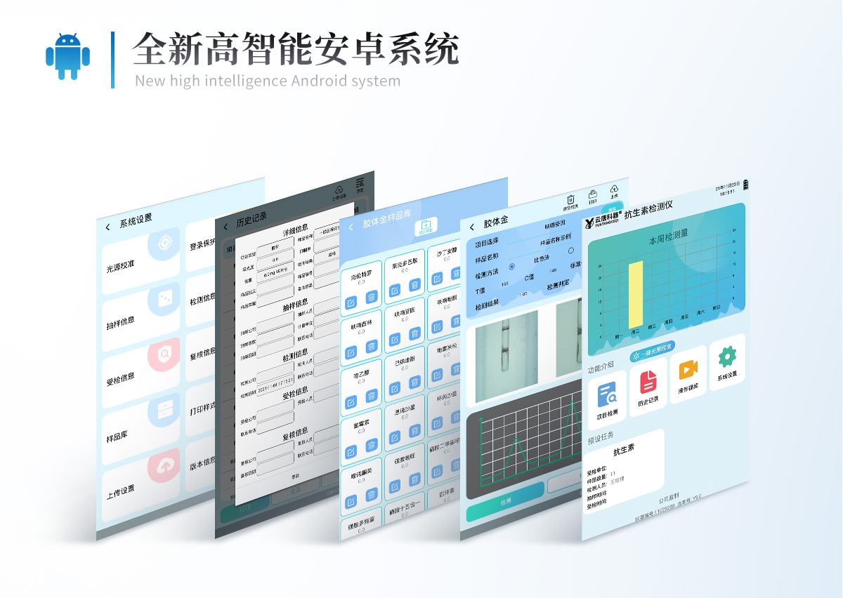 | 儀器采用10.1英寸液晶觸摸屏顯,搭配運行安卓智能操作系統,主控芯片采用ARM Cortex-A7,RK3288/4核處理器,主頻1.88Ghz,運轉速度更快速,性能更強。 | 儀器功能包括:膠體金檢測模塊、數字化管理模塊、無線通訊模塊等,可以滿足同一軟件下實現所有檢測項目的檢測,并在同一窗口展示檢測結果。 | 一體化臺式快檢設備,采用交直流兩用供電方式,可連接車載電源,配備6ah大容量充電鋰電池,可以滿足現場及流動檢測使用的需求。儀器尺寸:43×35×20cm, 主機凈重:5.1kg | 系統自帶數據集成模塊,設備首頁自動統計檢測數據包含:周檢測數據、月檢測數據,全部檢測總數量,均包含檢測總數,合格數,不合格數,以及相關柱形分析圖,對各項檢測數據清晰掌握,無需電腦查詢,更加快捷直觀。 | 儀器具有任務預設模塊,可在樣品送檢前提前預設樣品名稱、檢測指標、送檢單位等信息,樣品送檢時一鍵調取保存信息,檢測更加方便快捷。 | 直插式自動掃描方式,可實時顯示金標卡實時圖像,系統自動分析并呈現出CT曲線圖,CT線自動識別,無需手動調整,完成檢測后自動退出檢測卡。 | 結果判定線可修改,對照值標定值可保存,斷電不丟失數據。 | 兼容市場上其他膠體金卡,使用耗材不受限制,極大增強用戶使用體驗。 | 儀器檢測系統擁有龐大數據庫,并且構建了完善的檢索、修訂功能。食品庫涵蓋多種樣品名稱,可按需添加或刪除、編輯樣品名稱;產品數據庫以及歷史檢測記錄支持一鍵檢索功能。 | 系統打印自定義化,打印格式多樣化,產品合格證(****要求),二維碼,抽樣信息、檢測信息,受檢信息、復核信息、抽樣日期、檢測日期等信息結果,可按需求自行設置打印內容。 | A4紙版本報告打印功能(可選配):設備擁有兩種結果展示方式,可以自動生成A4打印模板和小票打印模板兩種樣式,可通過WiFi及網線等方式鏈接外置打印機可進行打印 | 儀器具有 wifi 聯網上傳、RJ45網線連接功能,可以快速上傳數據。同步對接監管平臺,數據可局域網和互聯網數據上傳,檢測結果直接傳至食品安全監管平臺。進行區域食品安全監管及大數據分析處理與數據統計,檢測區域食品安全長短期動態,達到食品安全問題預估、預警。 | 設備支持U盤存儲,標準USB接口,免驅動安裝。檢測結果存儲容量20萬條以上,可生成Excel表格,進行一鍵拷貝,并具有登錄保護功能,可設置用戶名及密碼,規范不同人員操作權限,防止非工作人員操作,并且可以進行重新校準、鎖定、恢復出廠設置功能。儀器固件可升級,后期檢測項目可擴充。 | 儀器具有重新校準、鎖定、恢復出廠設置功能。 | 儀器具備遠程升級功能,可定向分客戶分儀器更新,開機后自動更新,并可持續性免費更新系統版本,無需像傳統產品返廠更新,節省時間及人力成本并避免了物流運輸返廠升級導致設備損壞的潛在風險。 |