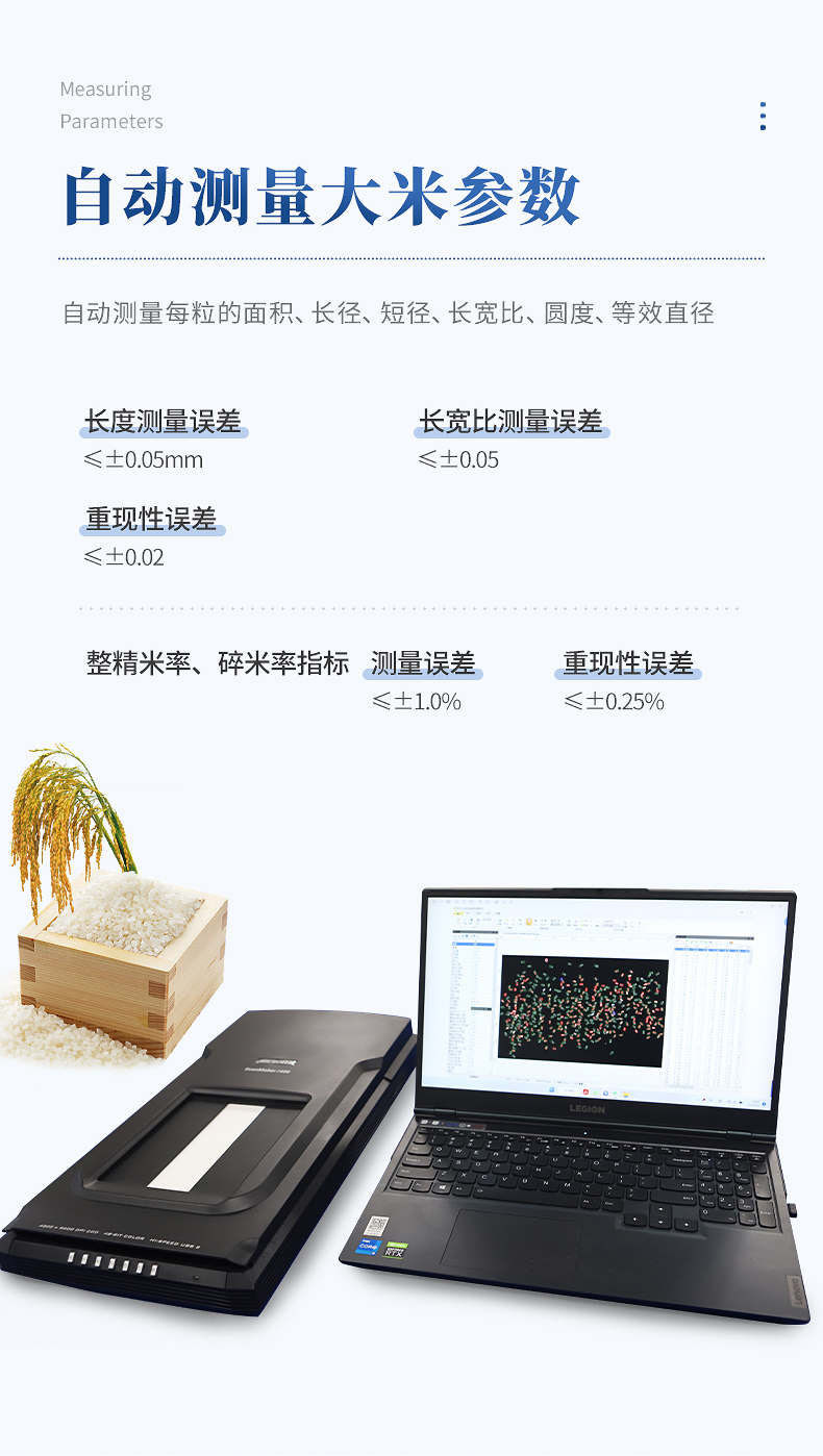 3、自動測量每粒的面積、長徑、短徑、長寬比、圓度、等效直徑(長度測量誤差≤±0.05mm,長寬比測量誤差≤±0.05,重現性誤差≤±0.02;整精米率、碎米率指標測量誤差≤±1.0%、重現性誤差≤±0.25%)。