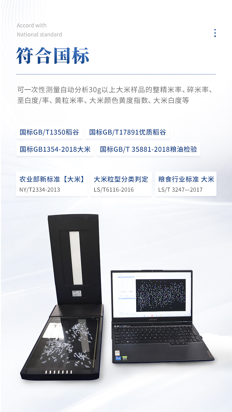 5、可大批量自動分析處理與輸出結果。與國標GB/T1350稻谷、GB/T17891優質稻谷或GB1354-2018大米、農業部新標準【大米】NY/T2334-2013、大米粒型分類判定LS/T6116-2016、糧食行業標準 大米LS/T 3247—2017、GB/T 35881-2018糧油檢驗 稻谷黃粒米含量測定圖像分析法等標準相對應,檢測各項指標的質量比和粒數比。