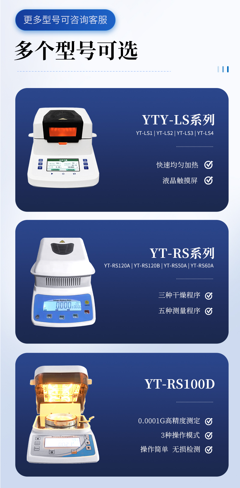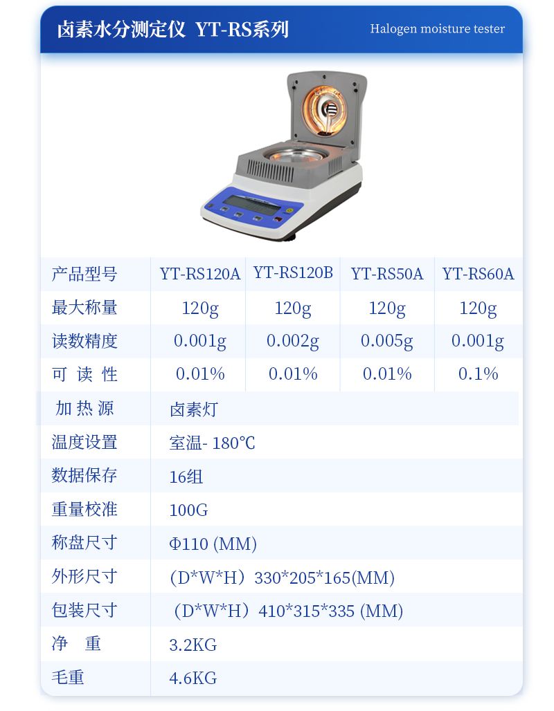 | 型號(hào) :YT-RS120A,**稱量值:120g ,顯示分度值:0.001g,可 讀 性 :0.01% | 型號(hào) : YT-RS120B,**稱量值:120g ,顯示分度值: 0.002g ,可 讀 性 :0.01% | 型號(hào) : YT-RS50A,**稱量值:120g ,顯示分度值: 0.005g ,可 讀 性 :0.01% | 型號(hào) : YT-RS60A,**稱量值:120g ,顯示分度值: 0.01g ,可 讀 性 :0.1% | 加 熱 源 鹵素?zé)? 溫度設(shè)置 室溫- 180℃ | 數(shù)據(jù)保存 16組 重量校準(zhǔn) 100g | 稱盤(pán)尺寸 φ110 (mm) | 外形尺寸 (D*W*H)330*205*165(mm) | 包裝尺寸 (D*W*H)410*315*335 (mm) | 凈 重 3.2kg 毛 重 4.6kg |
