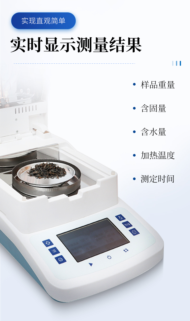 環(huán)狀的鹵素?zé)舸_保樣品得到均勻加熱,操作簡(jiǎn)便、測(cè)量準(zhǔn)確。水分測(cè)定儀在測(cè)量樣品重量的同時(shí),儀器采用環(huán)形管鹵素加熱方式,快速干燥樣品,在干燥過(guò)程中,水分儀持續(xù)測(cè)量并即時(shí)顯示樣品丟失的水分含量%,干燥程序完成后,*終測(cè)定的水分含量值被鎖定顯示。與國(guó)際烘箱加熱法相比,鹵素加熱可以在高溫下將樣品均勻地快速干燥,樣品表面不易受損,其檢測(cè)結(jié)果與國(guó)標(biāo)烘箱法具有良好的一致性,具有可替代性,且檢測(cè)效率遠(yuǎn)遠(yuǎn)高于烘箱法。智能化操作,一般樣品只需幾分鐘即可完成測(cè)定。該儀器操作簡(jiǎn)單,測(cè)試準(zhǔn)確,顯示部分采用液晶顯示屏-使屏幕更加清晰明亮,示值清晰可見(jiàn),分別可顯示水分值,樣品初值,終值,測(cè)定時(shí)間,溫度初值,*終值等數(shù)據(jù),并具有與計(jì)算機(jī),打印機(jī)連接功能、符合GLP規(guī)范的打印數(shù)據(jù)輸出。
