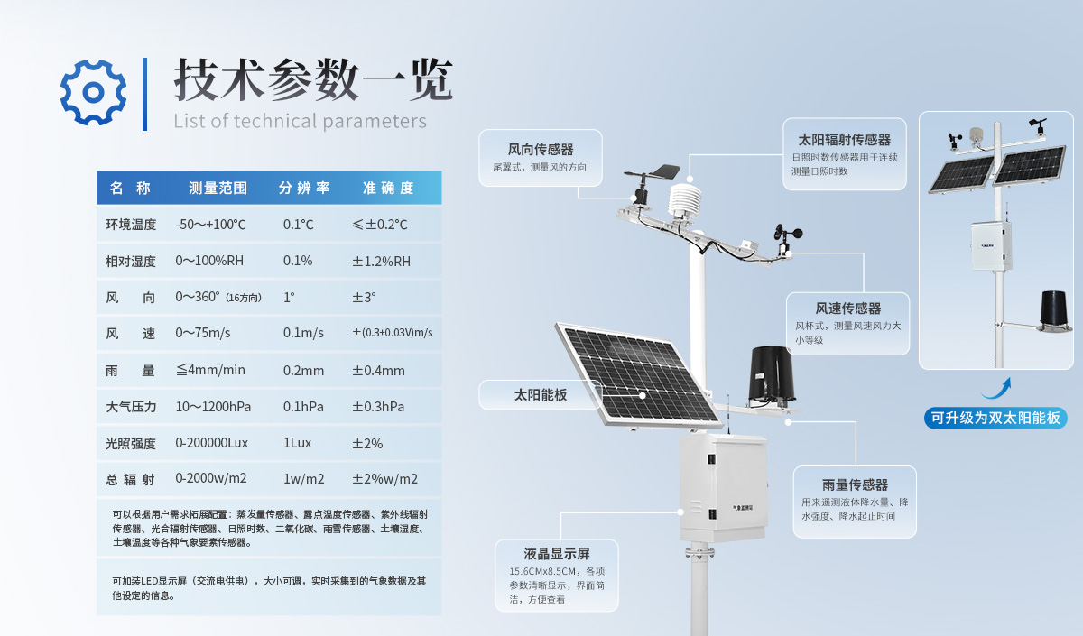 | 風(fēng)速:測(cè)量原理超聲波,0~70m/s(±0.1m/s);(發(fā)明專利,***** 2021 1 0237536.5) | 風(fēng)向:測(cè)量原理超聲波,0~360°(±1°);(發(fā)明專利,***** 2021 1 0237536.5) | 空氣溫度:測(cè)量原理二極管結(jié)電壓法,-40℃~85℃(±0.3℃);(北京市氣象局校準(zhǔn)證書) | 空氣濕度:測(cè)量原理電容式,0~100%RH(±2%RH);(北京市氣象局校準(zhǔn)證書) | 大氣壓力:測(cè)量原理壓阻式,300hPa~1100hPa(±0.02hPa);(北京市氣象局校準(zhǔn)證書) | PM2.5:測(cè)量原理光散射,0-1000ug/m3(±15%) | PM10:測(cè)量原理光散射,0-1000ug/m3(±15%) | 噪聲:測(cè)量原理電容式,30~130dB(±1.5dB) | 光照:測(cè)量原理光電效應(yīng),0-100Klx(±3%) | 光學(xué)雨量:測(cè)量原理光電式,0~4mm/min(±4%); | 采集器供電接口:GX-12-3P插頭,輸入電壓5V,帶RS232輸出Json數(shù)據(jù)格式,采集器供電:DC5V±0.5V峰值電流1A | 傳感器modbus、485接口:GX-12-4P插頭,輸出供電電壓12V/1A,設(shè)備配置接口:GX-12-4P插頭,輸入電壓5V | 太陽能供電、配置鉛酸電池,可選配30W 20AH/50W 40AH/100W 100AH.充電控制器:150W,MPPT自動(dòng)功率點(diǎn)跟蹤,效率提高20% | 數(shù)據(jù)上傳間隔:30s-65535s可調(diào) | 7寸安卓觸屏,屏幕尺寸:1024*600 RGB LCD | 整機(jī)取得國家氣象計(jì)量站校準(zhǔn)證書 | 整機(jī)取得實(shí)用新型專利,***** 2020 2 3208599.8 | 生產(chǎn)企業(yè)具有ISO質(zhì)量管理體系、環(huán)境管理體系和職業(yè)健康管理體系認(rèn)證 | 生產(chǎn)企業(yè)具有知識(shí)產(chǎn)權(quán)管理體系認(rèn)證證書和計(jì)算機(jī)軟件注冊(cè)證書 | 生產(chǎn)企業(yè)為3A級(jí)信用企業(yè) |