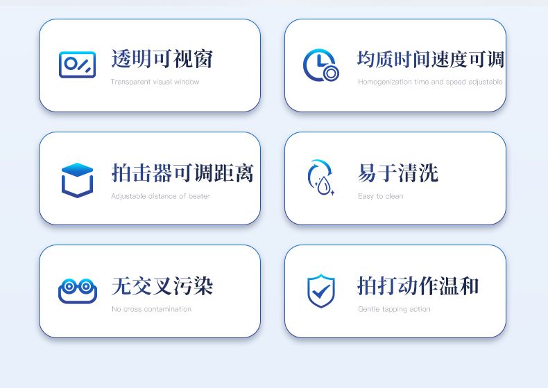 | 1. 拍打動作溫和,避免過度破碎,適合微生物檢測。 | 2. 使用一次性無菌袋,無交叉污染。 | 3. 均質(zhì)時間、拍打速度可調(diào)。 | 4. 可儲存九組工作程序,一鍵操作。 | 5. 拍擊器可調(diào)整前后距離。 | 6. 全開啟式門,易于清洗。 | 7. 帶有透明可視窗,方便觀察樣品均質(zhì)效果。 | 8. 開門停機,確保安全。 |