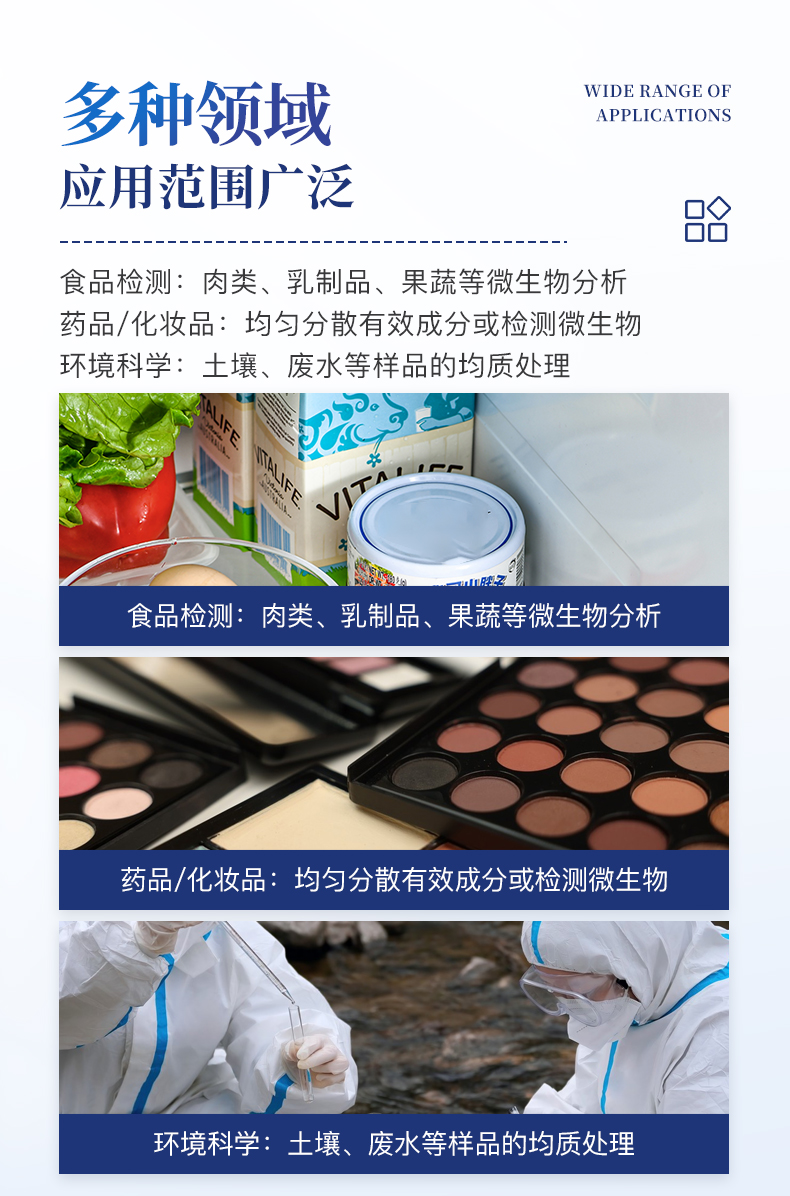 | 食品檢測:肉類、乳制品、果蔬等微生物分析。 | 藥品/化妝品:均勻分散有效成分或檢測微生物。 | 環(huán)境科學:土壤、廢水等樣品的均質(zhì)處理。 |