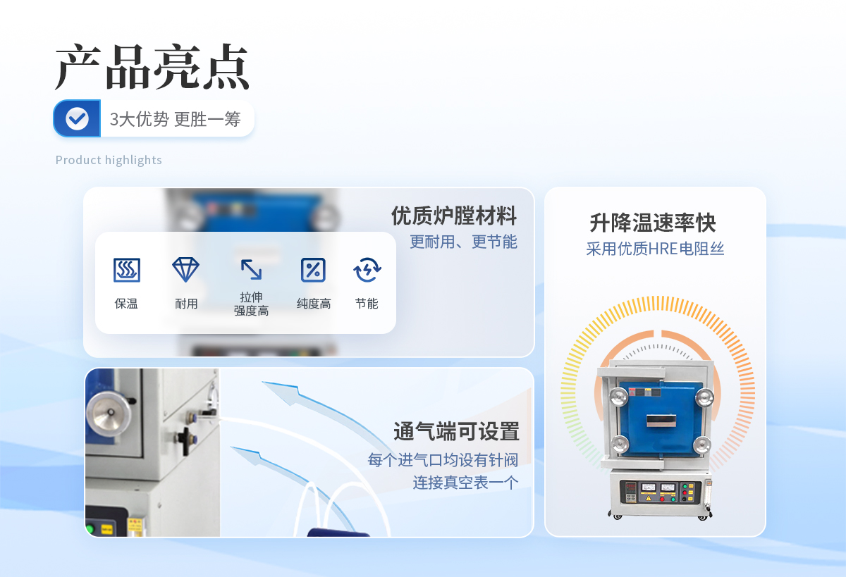 用于高校、科研院所、工礦企業做高溫氣氛燒結、氣氛還原、CVD實驗、真空退火等。具有溫場均勻、升降溫速率快、節能、可通入多重氣體等特點。