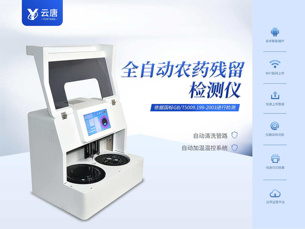 云唐全自動農藥殘留檢測儀YT-NY2000,檢測標準:依據****方法(GB/T5009.199-2003)以及世界衛生組織WHO、世界糧農組織FAO殘留農藥檢測標準、世界環境保護局EPA參照攝入量等要求來設計。采用酶抑制率比色法對水果、蔬菜等農林產品中有機磷和氨基甲酸酯類農藥含量進行快速準確的檢測。