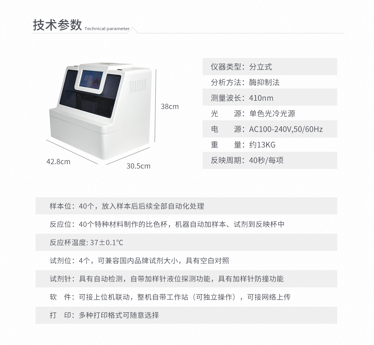 | 波長配置:410 | 試 劑 針:3根 | 檢測通道:20個 | 反應溫度:37℃,儀器具有自動加溫溫控系統 | 觸 摸 屏:7寸觸摸屏,可單機操作 | 比 色 皿:容量 0 - 4.5ml | 試 劑 盒:配套試劑存放盒,可整體取出 | 清洗功能:可自動清洗試劑管路,避免試劑污染 | 加樣功能:儀器按照試劑要求自動、按時、按量加入試劑,提高工作效率 | 自動混勻:儀器測試過程中自動震蕩混勻保證試劑充分反應 | 實時監控:儀器測試過程中顯示實時運行狀態 | 打印功能:內置熱敏打印機,可快速打印檢測結果,方便數據留存 | 數據存儲:大容量存儲器,能存儲12萬條數據 | 數據接口:外接USB接口,網線接口 | 網絡連接:可連接有線網絡和無線wifi | 上位機軟件:儀器配套電腦端上位機軟件,可通過軟件進行寫入參數及讀取數據 | 樣本檢測:儀器自動對未正常放置的樣本或異常的樣本進行檢查并報警提示 | 試劑檢測:儀器測試前和測試過程中時刻對試劑進行檢查,檢查試劑是否缺失,如有異常儀器會進行報警提示,對已經加入試劑的樣本進行正常測試,不影響測試結果,對未測試的樣本停止測試。 | 數據上傳:儀器數據可傳入電腦端,按照客戶需求進行保存或打印 | 儀器重量:約7KG | 儀器尺寸:410mm*290mm*202mm |