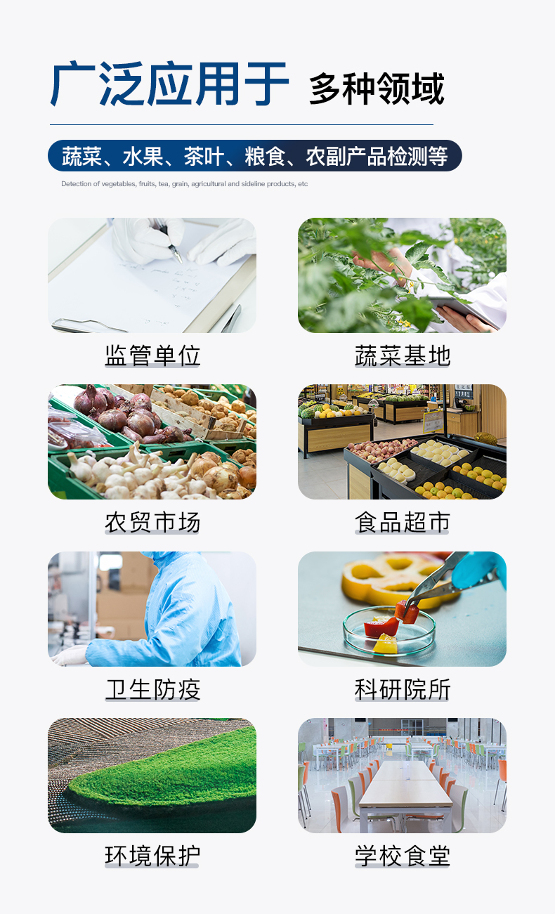 該儀器依據(jù)****(GB/T 5009.199-2003)和農(nóng)業(yè)標(biāo)準(zhǔn)方法(NY/T 448-2001)中的酶抑制率法設(shè)計(jì)制造,能準(zhǔn)確、快速檢測(cè)出蔬菜、水果、農(nóng)產(chǎn)品、茶葉等固體或液體中有機(jī)磷和氨基甲酸酯類農(nóng)藥殘留量。廣泛適用于各級(jí)食品安全監(jiān)測(cè)部門、蔬菜生產(chǎn)基地、蔬菜批發(fā)基地、農(nóng)貿(mào)市場(chǎng)、食品超市、食品安全檢測(cè)流動(dòng)車、衛(wèi)生防疫、環(huán)境保護(hù)等領(lǐng)域。