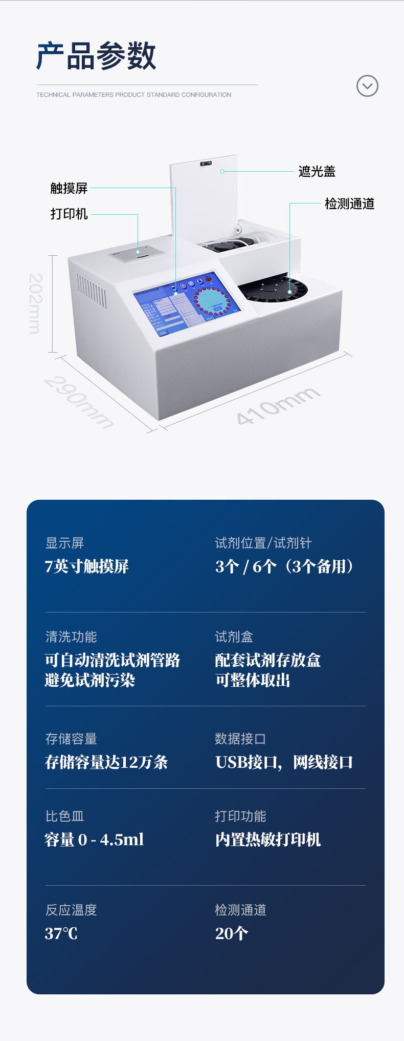 | 1. 波長(zhǎng)配置:410 | 2. 試劑位置:3個(gè) | 3. 試 劑 針:6個(gè)(3個(gè)備用) | 4.:檢測(cè)通道:20個(gè) | 5.反應(yīng)溫度:37℃ | 6.觸 摸 屏:7寸觸摸屏 | 7比 色 皿:容量 0 - 4.5ml | 8.試 劑 盒:配套試劑存放盒,可整體取出 | 9.清洗功能:可自動(dòng)清洗試劑管路,避免試劑污染 | 10.實(shí)時(shí)監(jiān)控:儀器測(cè)試過(guò)程中顯示運(yùn)行狀態(tài) | 11.打印功能:內(nèi)置熱敏打印機(jī) | 12.數(shù)據(jù)存儲(chǔ):大容量存儲(chǔ)器,能存儲(chǔ)12萬(wàn)條數(shù)據(jù) | 13.數(shù)據(jù)接口:外接USB接口,網(wǎng)線接口 | 14.儀器重量:約6KG | 15.儀器尺寸:410mm*290mm*202mm |