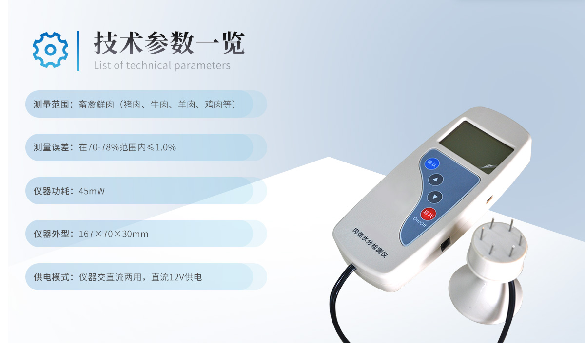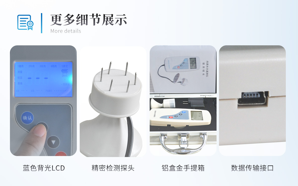| 畜禽鮮肉(豬肉、牛肉、羊肉、雞肉等) | 65~85% | 一次采樣時間< 1s | 每10次采樣或1次采樣輸出一次測量結果 | 在70~78%范圍內≤1.0% | 在70~78%范圍內≤ 0.5% | 超標報警 | 可設定每個品種的判斷標準。 | 交直流兩用 | 觸摸式按鍵 | 45mW | 167×70×30mm | 藍色背光LCD | 0~40℃ | 20~90 % RH | USB接口 |
