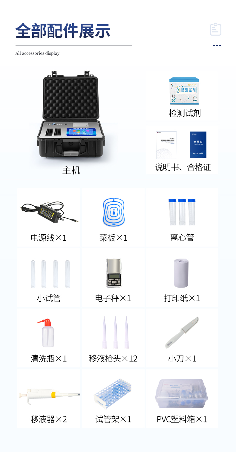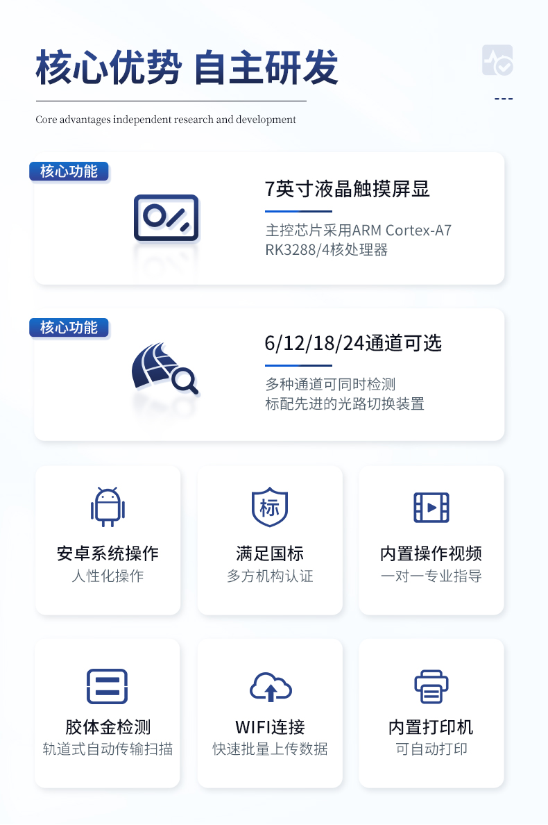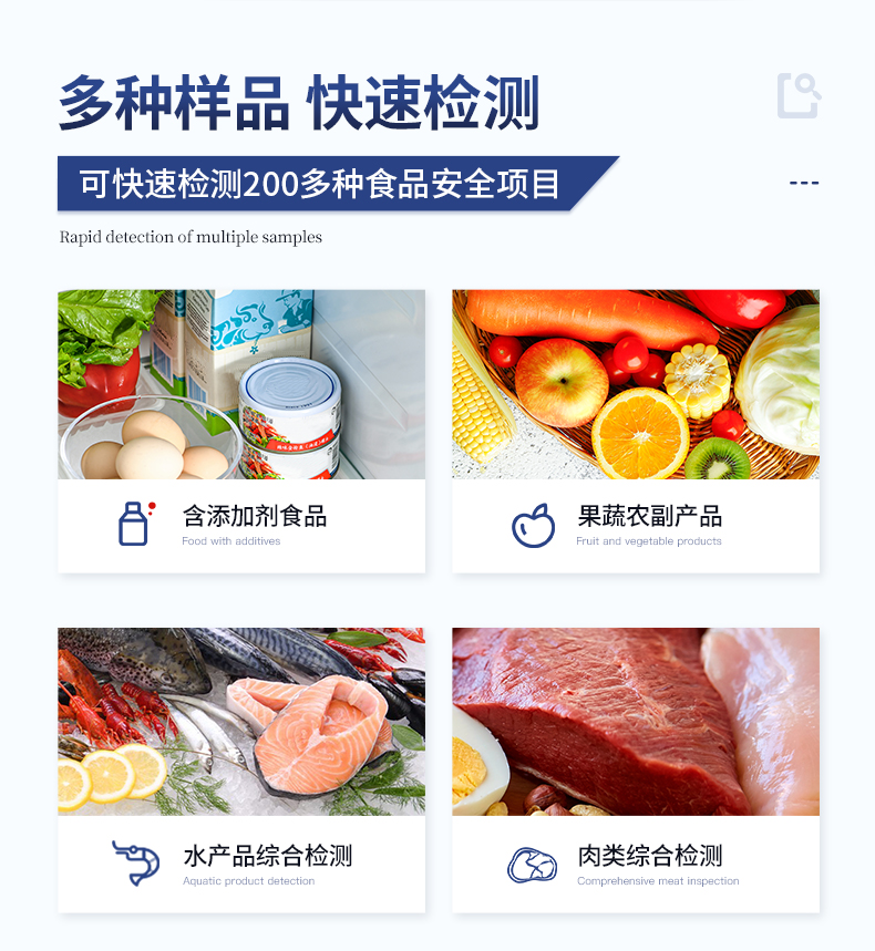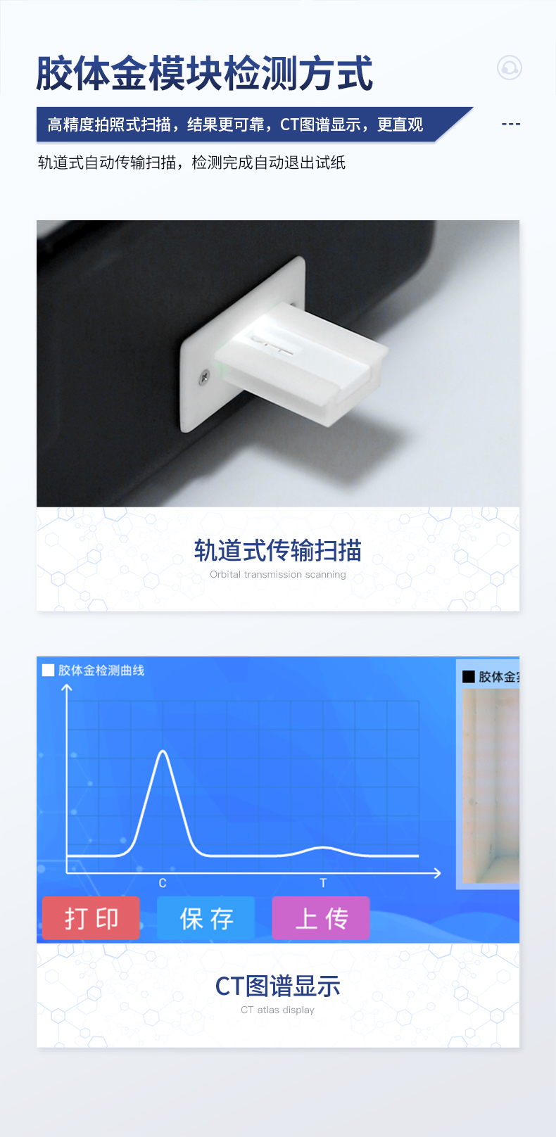 安卓智能操作系統,采用更加**的UI交互界面,儀器具有wifi聯網上傳、4G聯網傳輸、GPRS無線遠傳、網線連接功能,快速批量上傳數據。智能化程度高,儀器具有自檢功能:具有開機自檢和調零功能,具有自動檢測重復功能。新一代高速熱敏打印機,檢測完成可自動打印和批量打印檢測報告和二維碼。儀器帶有監管平臺,數據可局域網和互聯網數據上傳,檢測結果直接傳至食品安全監管平臺。進行區域食品安全監管及大數據分析處理與數據統計,檢測區域食品安全長短期動態,達到食品安全問題預估、預警一體化主機,包含光電比色測模塊、膠體金免疫層析檢測模塊。一體化便攜式快檢設備,滿足現場及流動檢測使用需求,能夠在同一軟件下實現所有檢測項目的檢測,并可通過同一窗口直觀顯示檢測結果。膠體金模塊檢測方式:軌道式自動傳輸掃描,檢測完成后自動退出檢測卡。食品安全檢測儀CT線自動識別,無需手動調整,檢測完成自動顯示CT坐標曲線。內置強大的數據庫,具有多品類多種類樣品菜單功能,可靈活選擇檢測樣品,不同的檢測通道可同時檢測不同的樣品項目。也可在儀器上直接編輯錄入樣品名稱、檢測指標、檢測單位等信息并保存進樣品數據庫。儀器內置操作演示視頻,是您身邊的化驗指導專家。儀器具有自身保護功能,可設置用戶名及密碼,防止非工作人員操作等。樣品處理簡單省力,整體操作快速、安全、便捷。高靈敏度,高檢測精度,高重復性精度,掃描式高精度光學傳感器。結果判定線可修改,對照值標定值可保存,斷電不丟失數據。兼容市場上所有的膠體金卡,使用耗材不受限制,極大增強用戶使用體驗。儀器具有重新校準、鎖定、恢復出廠設置功能。