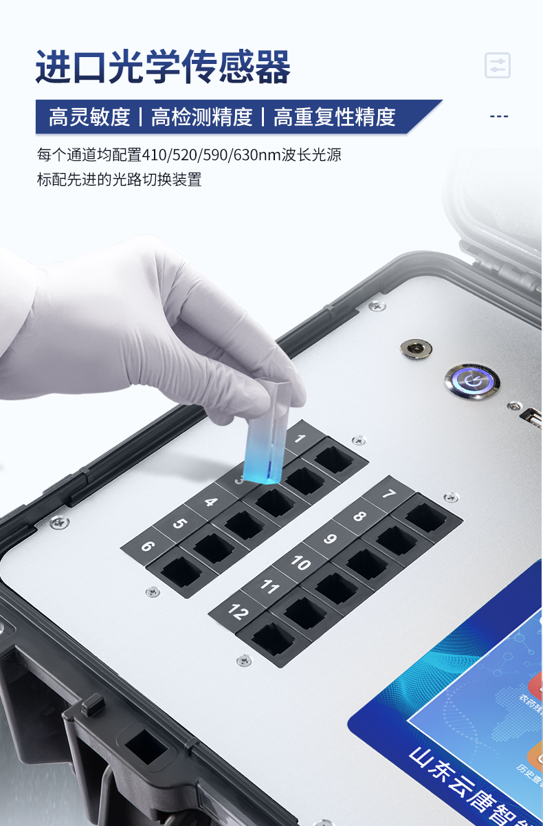 主控芯片采用ARM Cortex-A7,RK3288/4核處理器,主頻1.88Ghz,運轉速度更快速,穩定性更強。顯示方式:7英寸液晶觸摸屏顯示,人性化中文操作界面,讀數直觀、簡單。交直流兩用,直流12V供電,可連接車載電源,可配6ah大容量充電鋰電池,方便戶外流動測試。四波長冷光源,12個檢測通道,每個通道均配置410、520、590、630nm波長光源,標配**的光路切換裝置,專業光路切換功能可實現*多64波長,并且所有檢測項目可實現所有通道同時檢測。智能恒流穩壓,光強自動調節與校準,長時間連續工作光源無溫漂現象。內置新國家限量標準,與所測結果進行現場比對,并持續更新標準。不間斷進樣,連續檢測樣本編號自動累加數據無線上傳平臺,并可從平臺導出為Excel表格檢測結果存儲容量20萬條同時支持U盤拷貝,標準USB接口,免驅動插拔。檢測項目可擴充,固件可升級儀器尺寸:43×35×19cm, 主機凈重:5.1kg