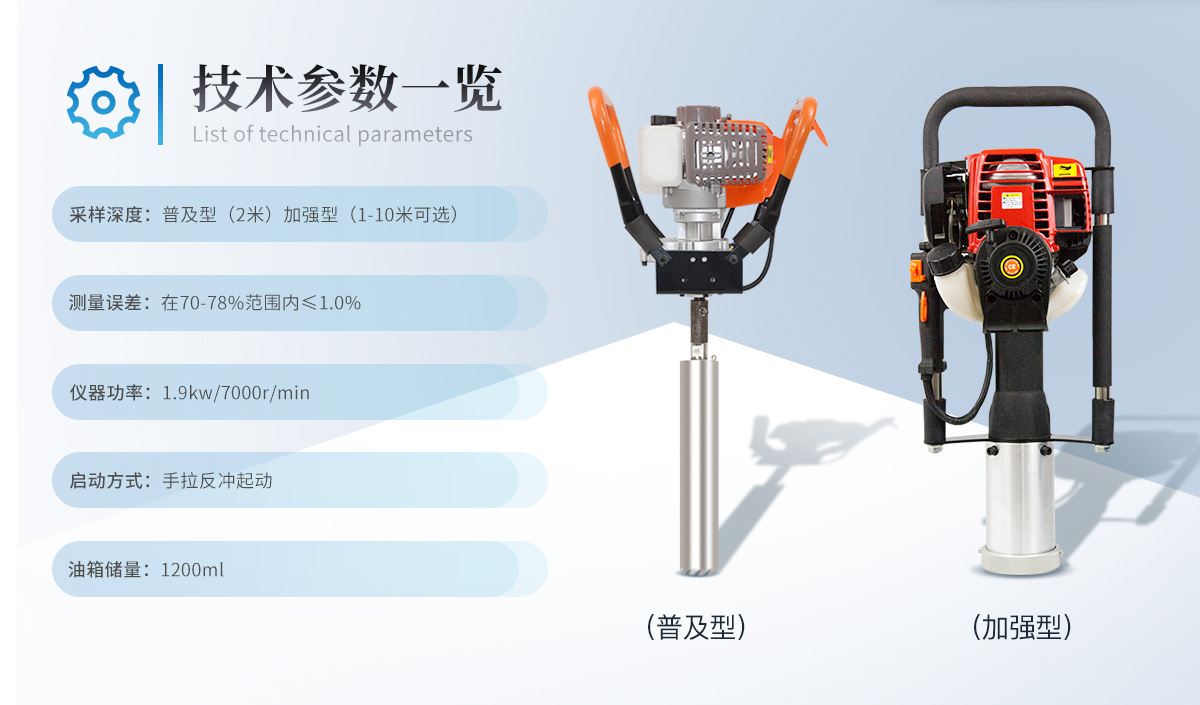 | 汽油動力發動機一臺,發動機工具包一套,標準土壤鉆頭、硬質土鉆頭隨意選配,不小于1米的鉆桿5根、不小于1米的塑料樣品管2根,刮刀、老虎鉗、耳機、5M卷尺、手套、清潔刷各1個,專用提取設備1套、工業塑料運輸箱1個 |