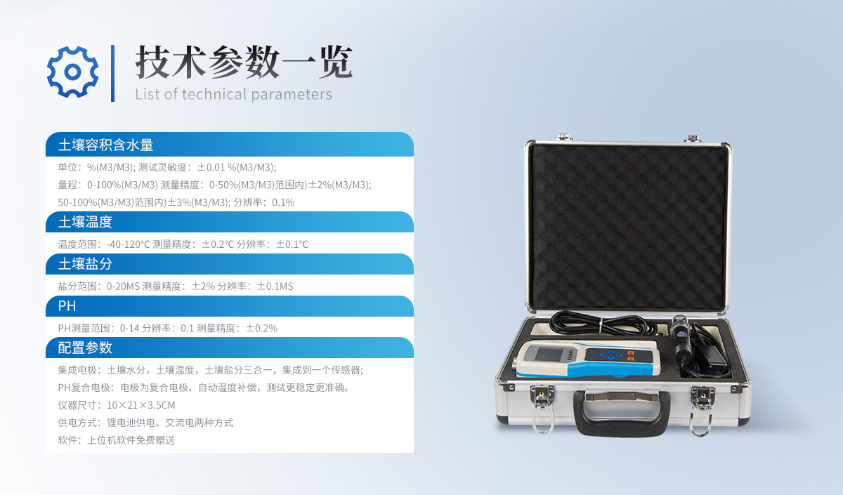 產品簡介: 土壤原位鹽分速測儀是一種便攜式常規測量分析儀器,采用一體化結構設計,可以測量土壤鹽分,有便攜式主機、傳感器、軟件等組成,操作簡便。 適用范圍: 該儀器廣泛應用于旱作節水灌溉···