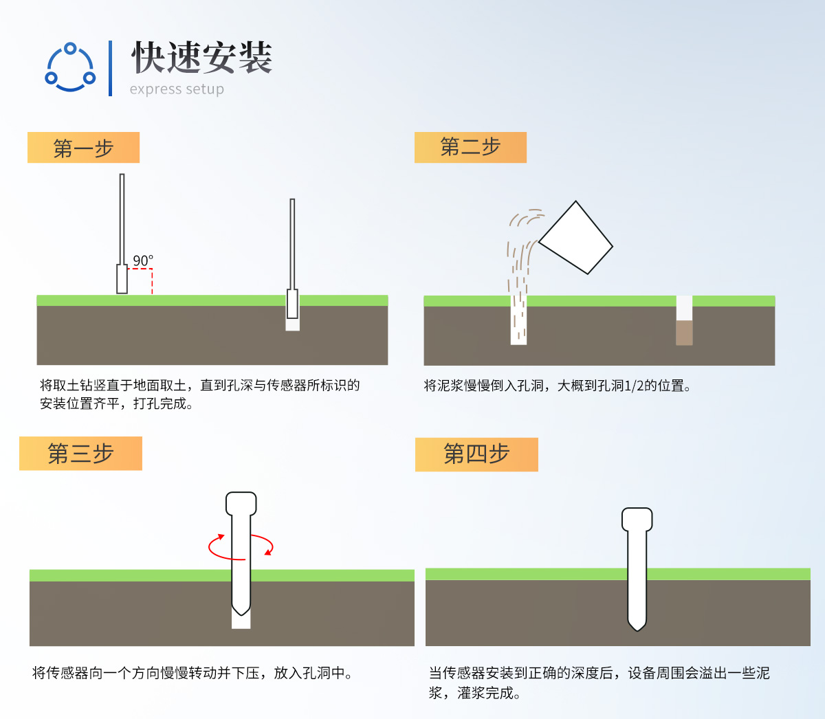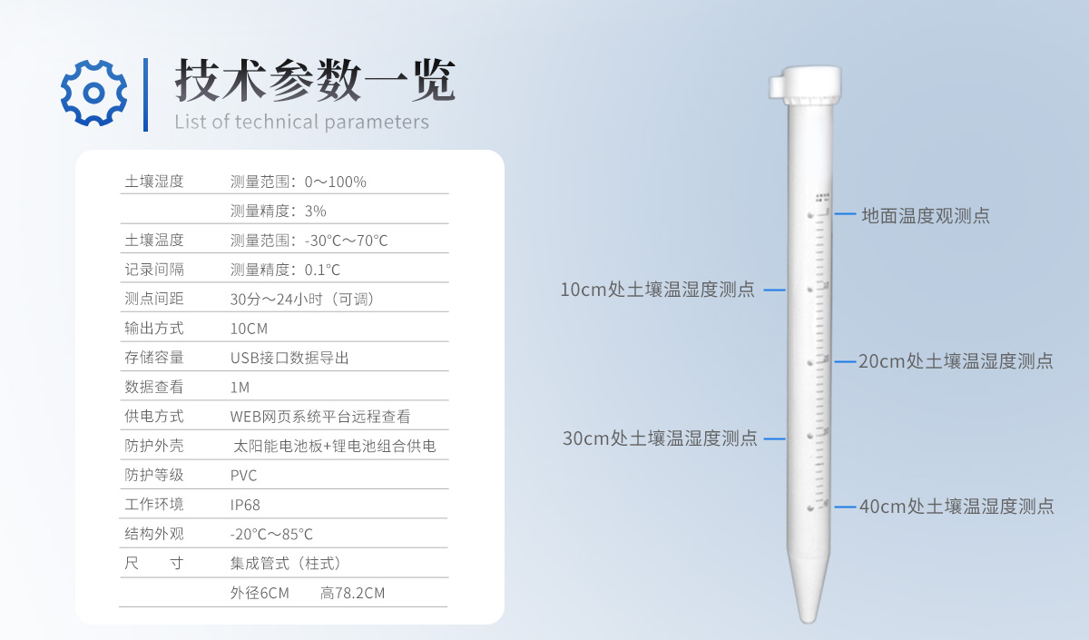 | 土壤水分測量范圍:(可選多層)0~100% 精度:±3% 分辨率:0.1% | 土壤溫測量度范圍:(可選多層)-40~120℃ 精度:±0.2℃ 分辨率:0.01℃ |