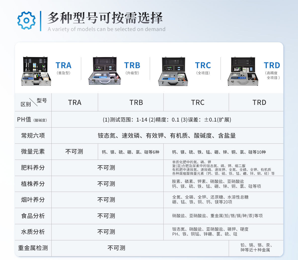| 儀器測定項目:測定土壤、肥料、食品、蔬菜、水果中重金屬(鉛、砷、鉻、鎘、汞、鐵、鋅、錳、銅)。 | 儀器擴展測試項目:儀器可以擴展測定土壤、肥料養分含量。 |