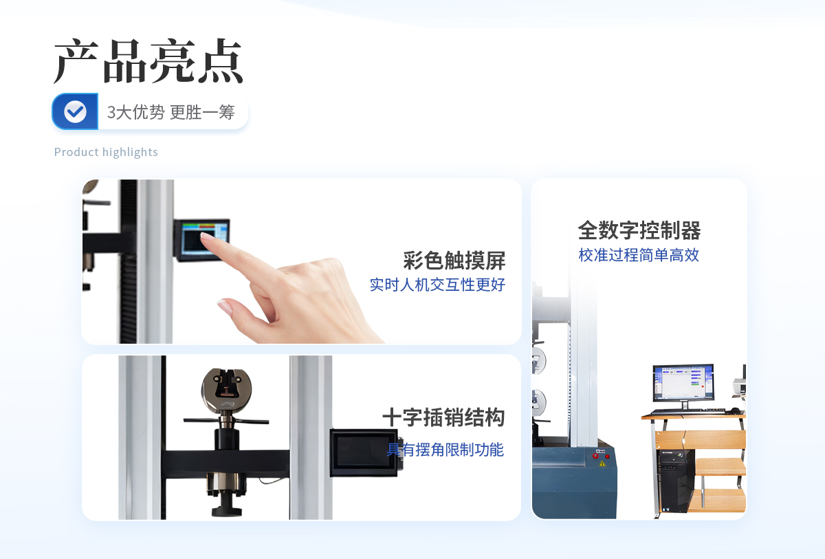 1、采用高精度、全數字調速系統及精密減速機,驅動精密絲杠副進行試驗,實現試驗速度的大范圍調節,試驗過程噪音低、運行平穩。2、萬向節采用十字插銷結構,而且具有擺角限制功能,一方面便于試樣夾持,保證試驗同心度,另一方面很好的消除了不規則試樣對傳感器的影響。3、觸摸鍵操作方式,液晶顯示器實時顯示。顯示界面可顯示試驗方法選擇界面、試驗參數選擇界面、試驗操作及結果顯示界面和曲線顯示界面,方便快捷。4、可實現試樣裝夾時橫梁快慢升降調整,具有過流、過壓、過載等保護裝置。5、選配微機接口,可外接微機實現試驗過程的控制及數據的存儲、打印。